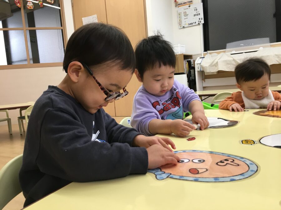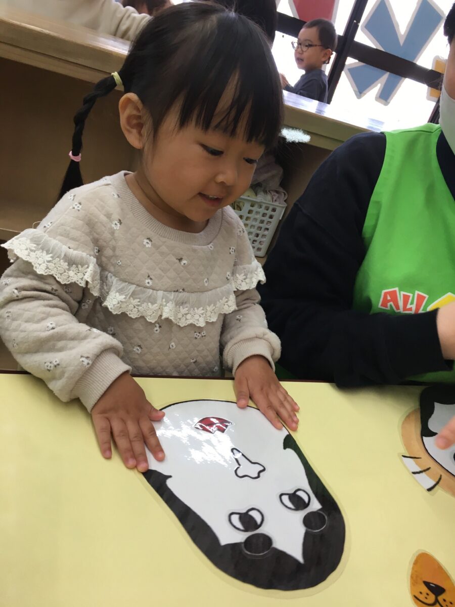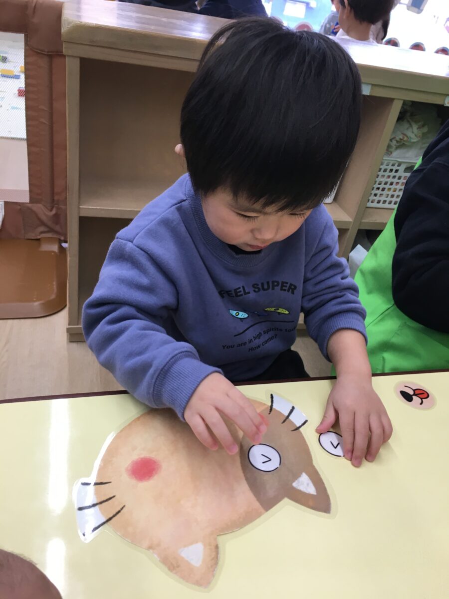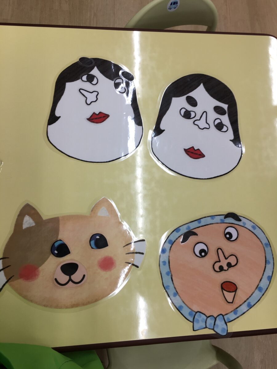 本来は目隠しをして行いますが、今日は子どもたちの好きなところにパーツを置いてもらいました。