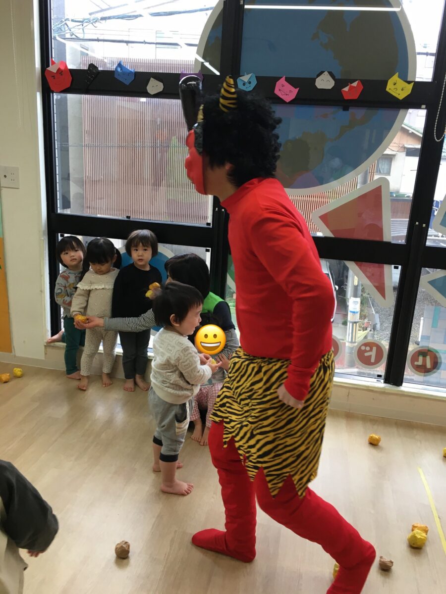 淵に寄る子、先生の背中に隠れる子、立ち向かって豆を投げる子、鬼に手を振る子と様々でした🤣