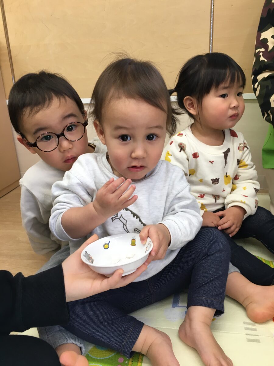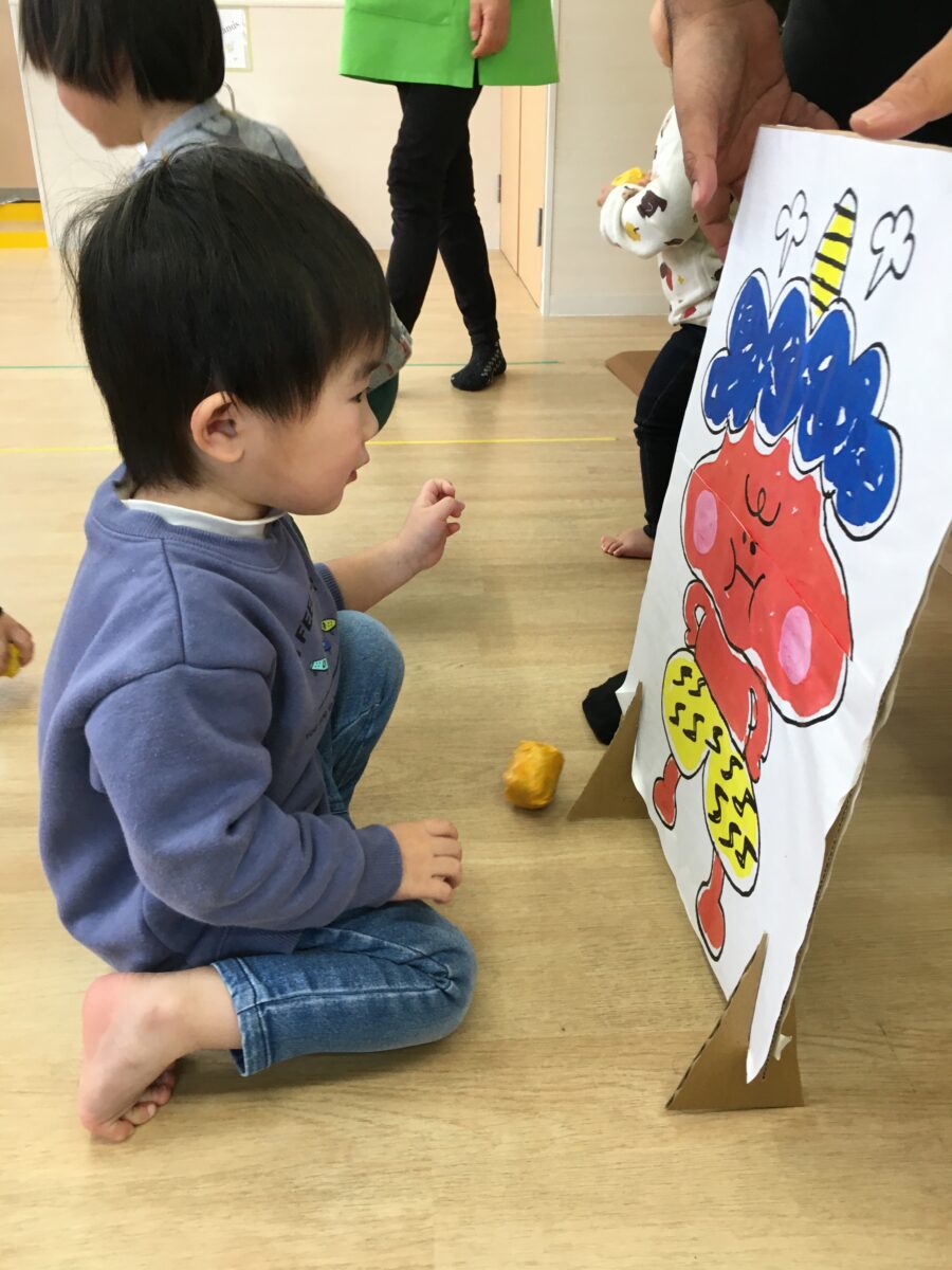 まずは、鬼の絵の的にむかって「おにはーそと!ふくはーうち!」と掛け声を言いながら豆まきをしました👍