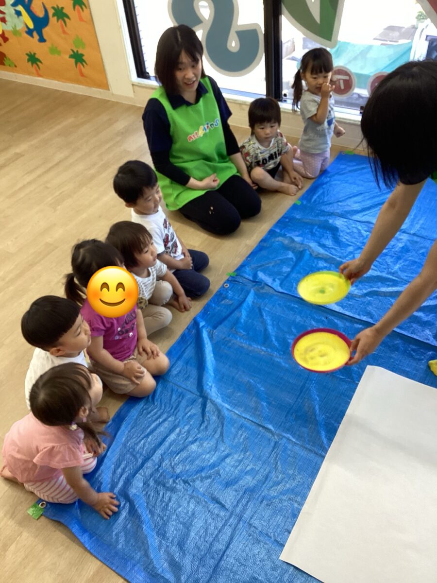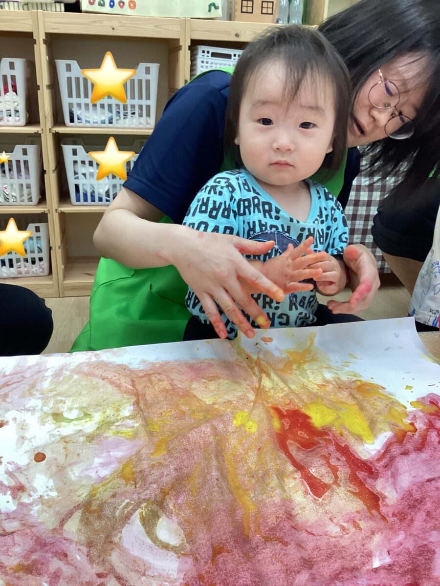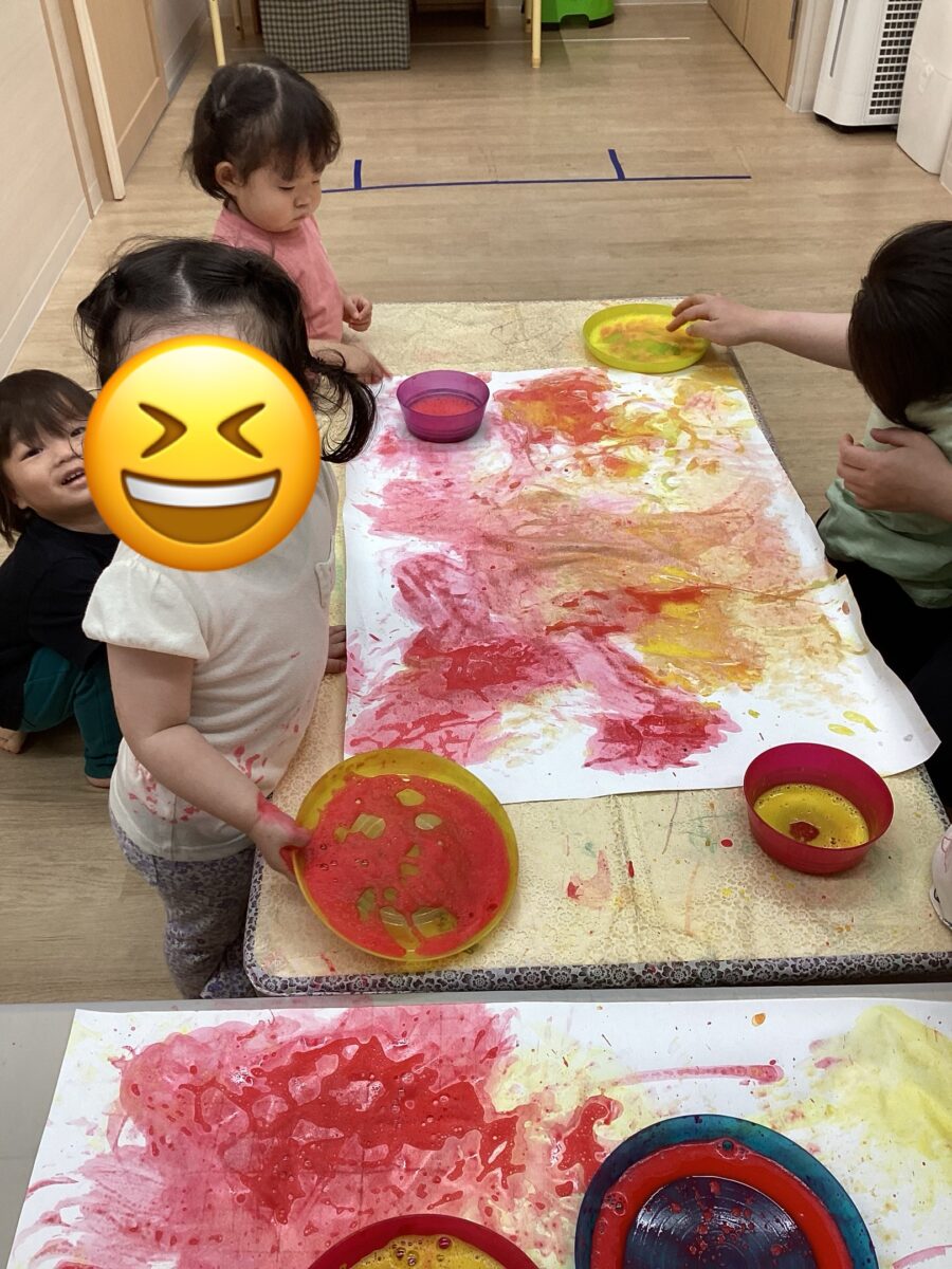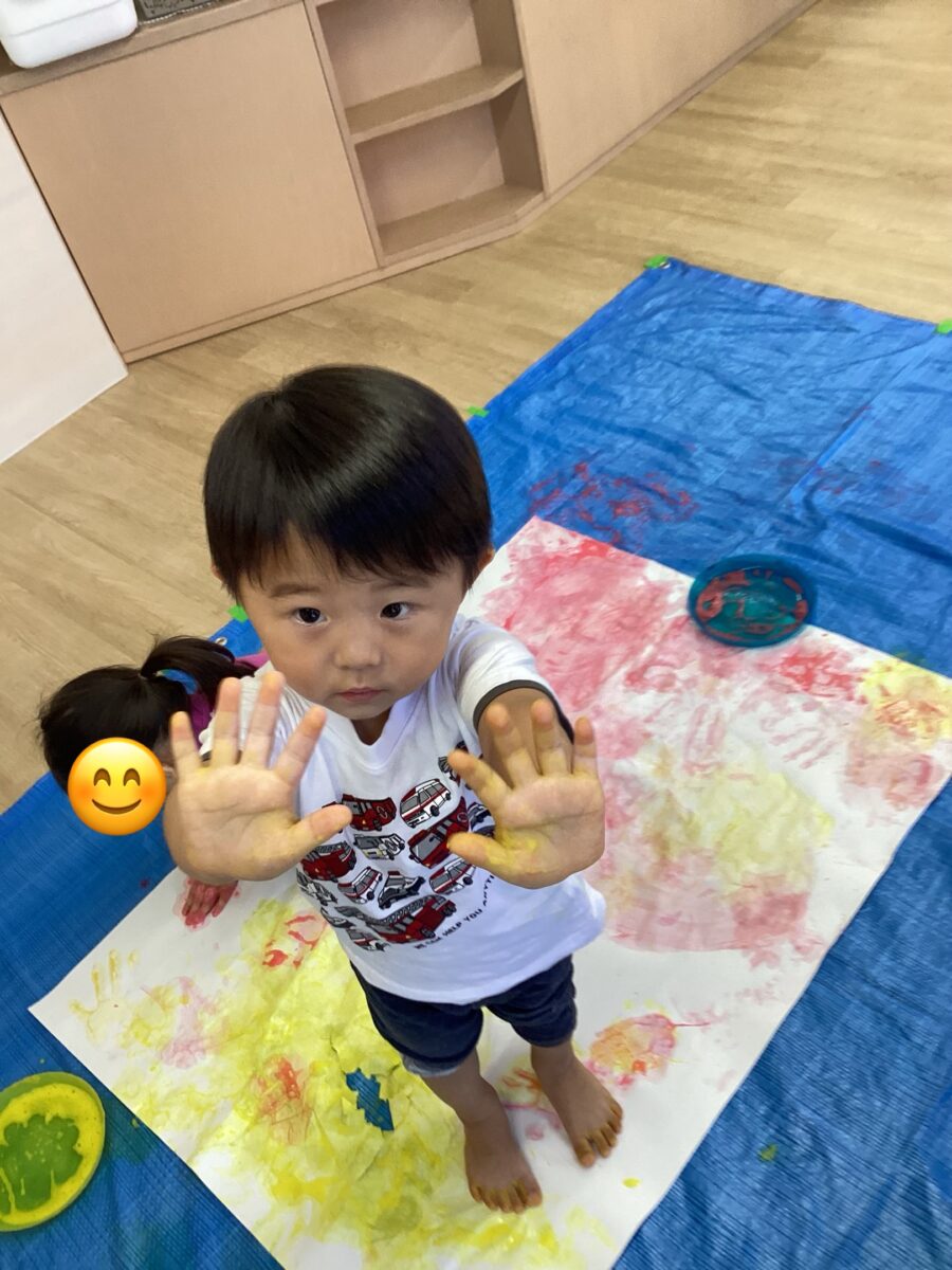 実際に始まると、手や足に絵の具をたくさん付けて、大きな紙の上にぺったんして、笑顔いっぱいに楽しく遊んでいました。😊