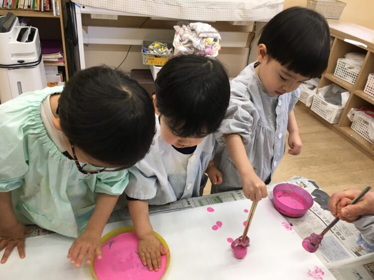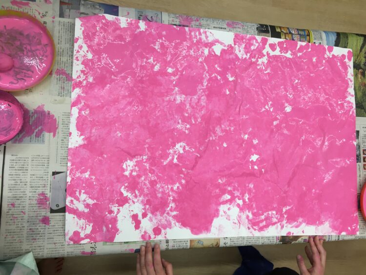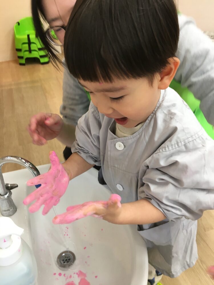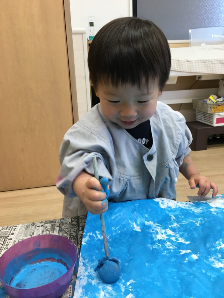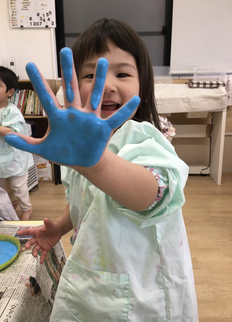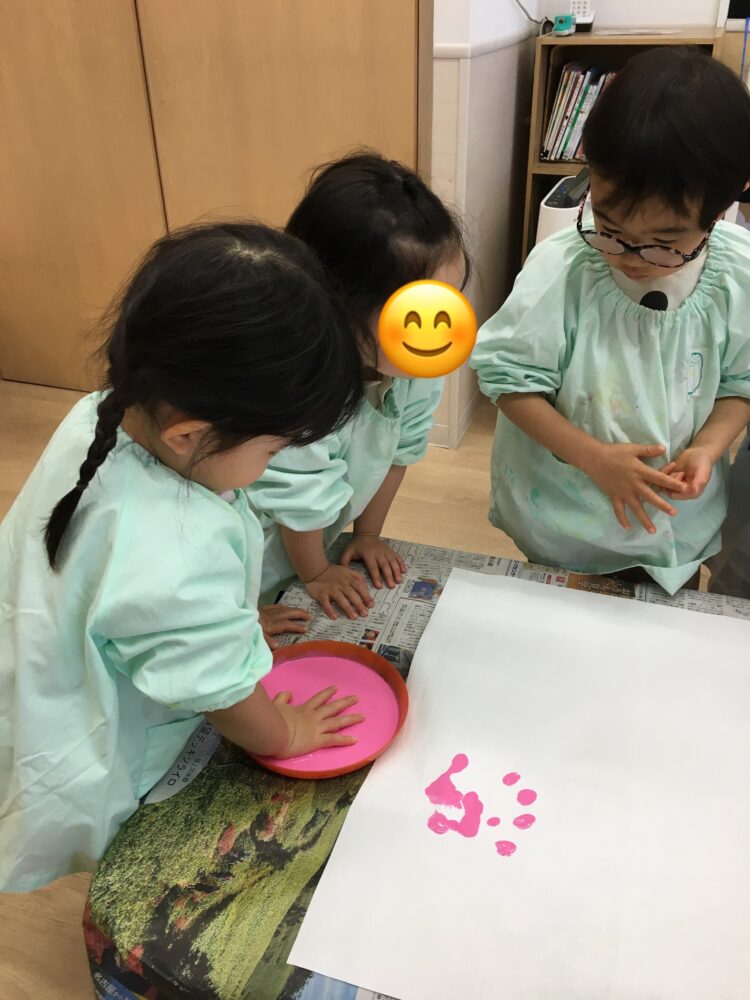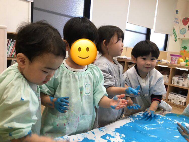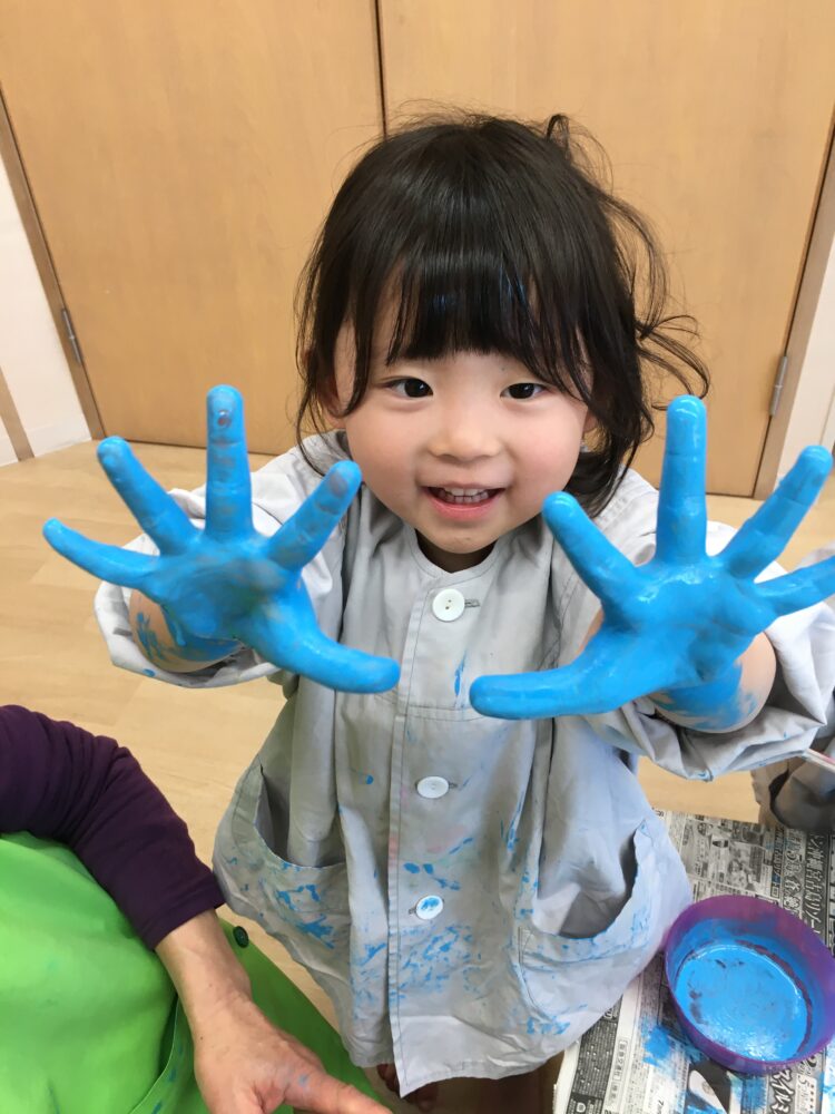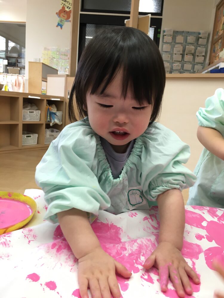 初めは少し遠慮がちに絵の具を触っていたお友だちも、次第に大胆になり、両手に絵の具をつけて楽しんでいました😊