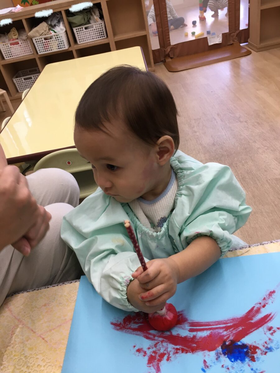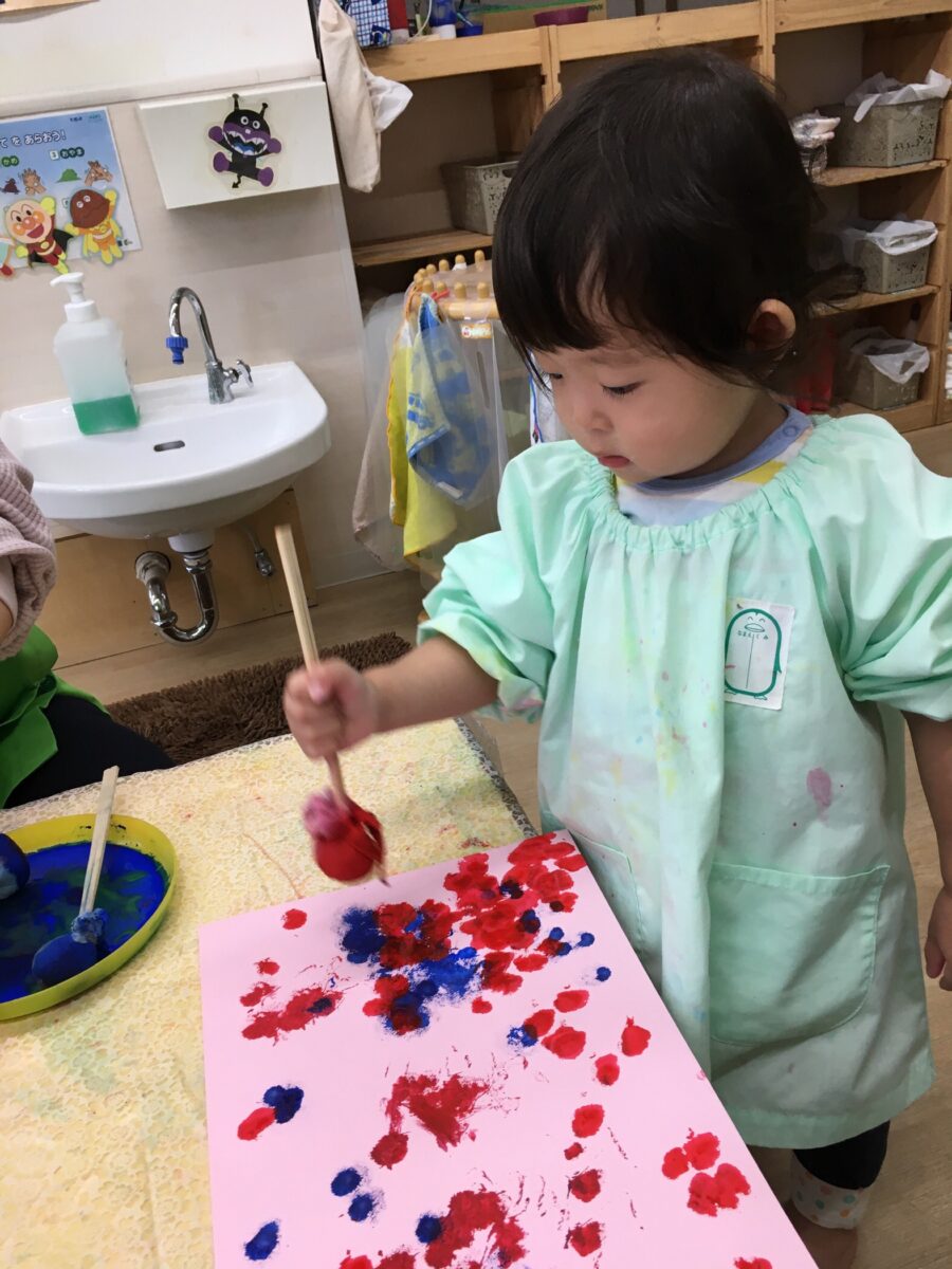 いちご組さんとばなな組さんは、タンポを使って色塗りをしました。