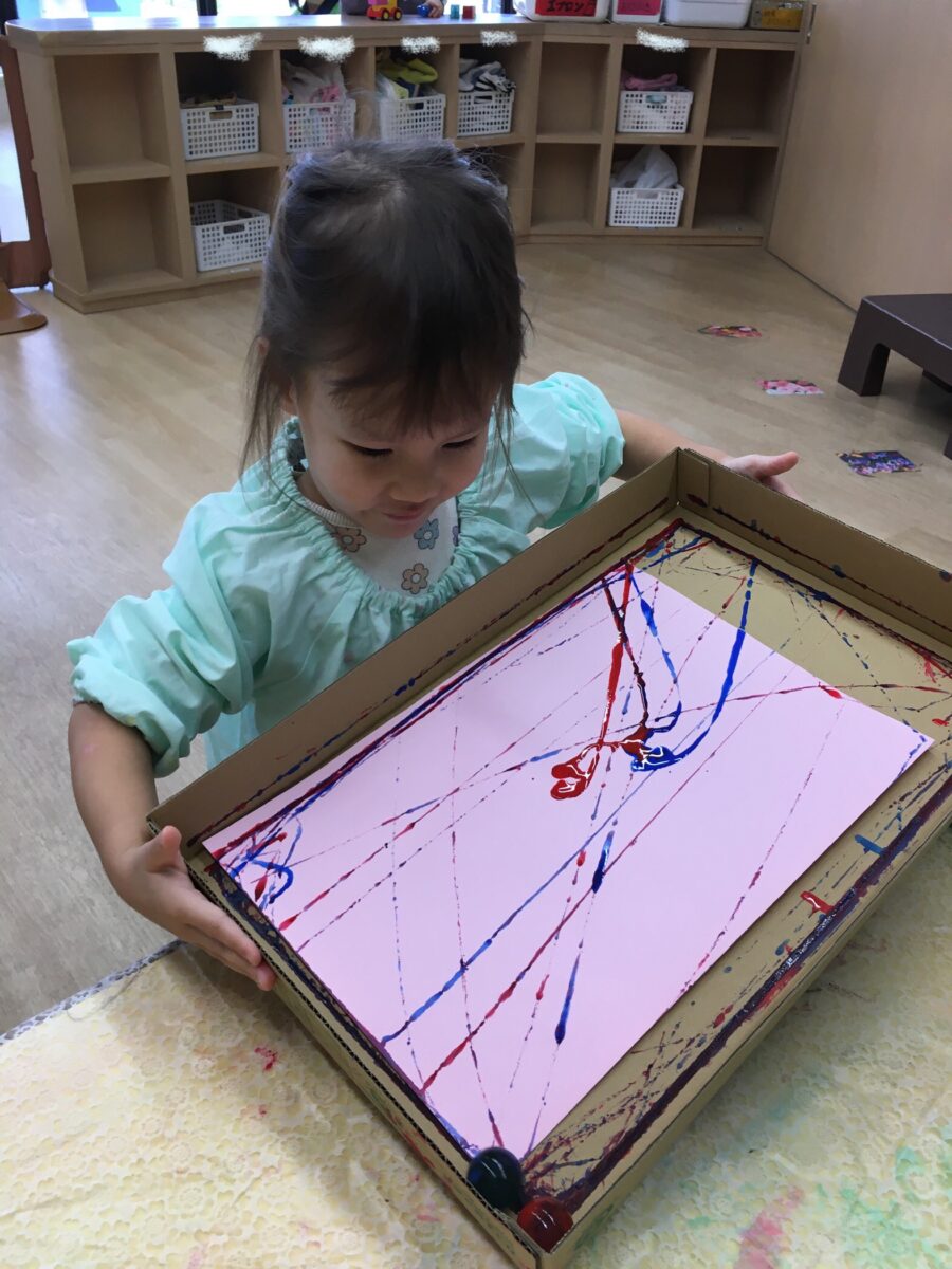 「よーい、スタート」と言ってビー玉を使ってたくさん転がして、思う存分楽しんでいました。