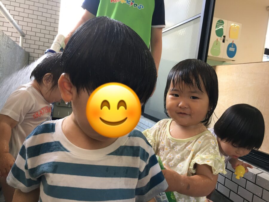先生のシャワーにとても喜んでいたり、ペットボトルのシャワーに水を入れて、水が流れる様子を眺めていたりしていました。