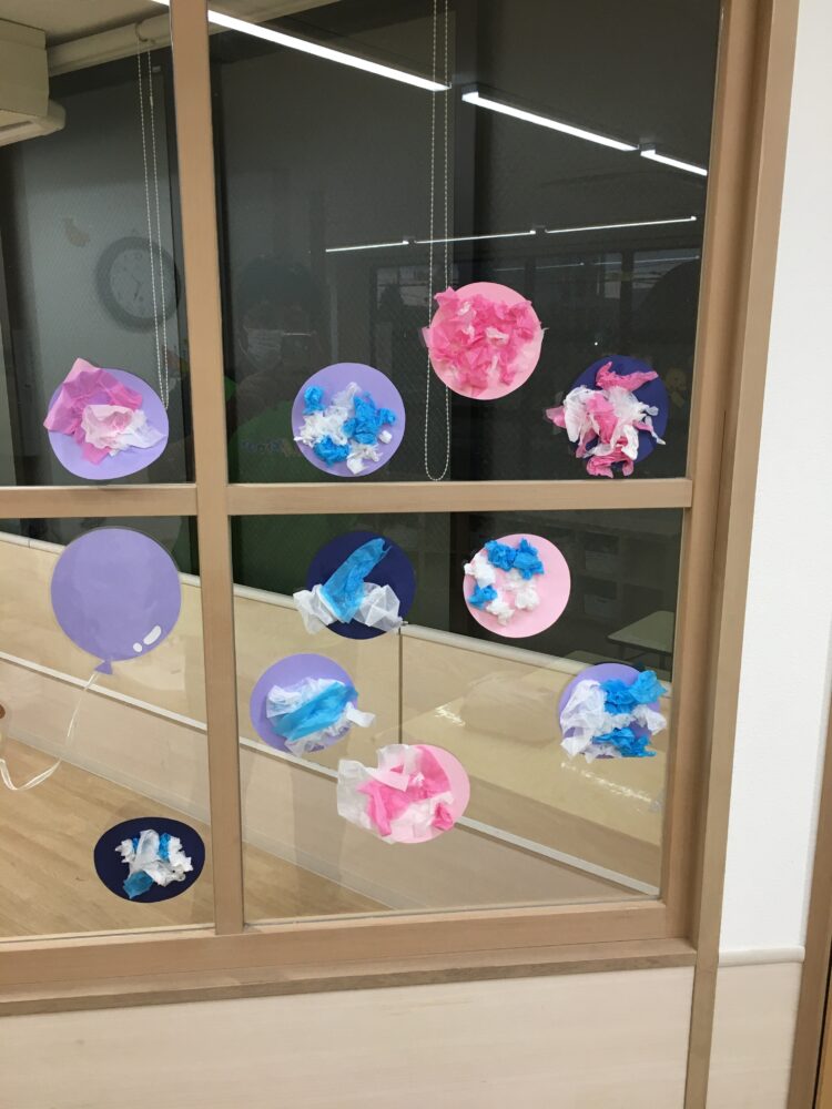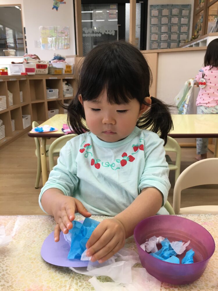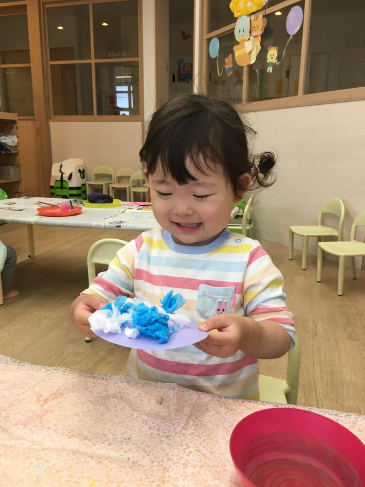 めろん組さんは、お花紙を破ることや丸めること、のりを付けるのを楽しんで、個性豊かな紫陽花を作りました。