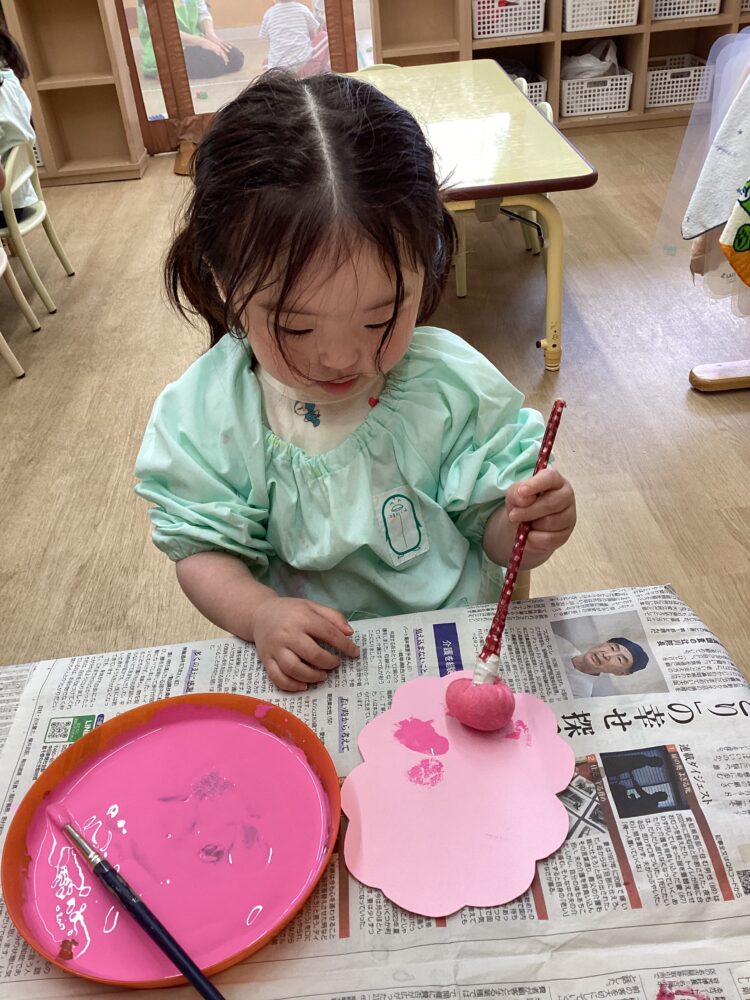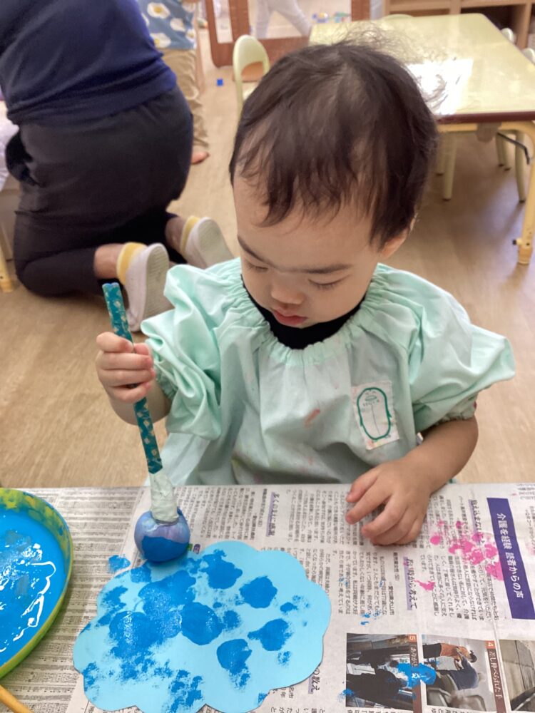 ばなな組さんのたんぽ遊びは、最初からやる気満々だったり、慎重だったりといろんな様子が見られました。次第にみんな、画用紙に色が付く楽しさを感じ始め、ぽんぽんとたんぽを押していました。