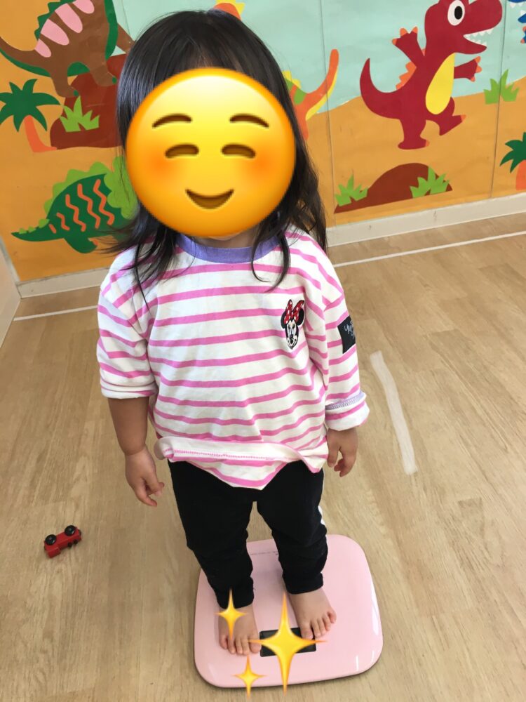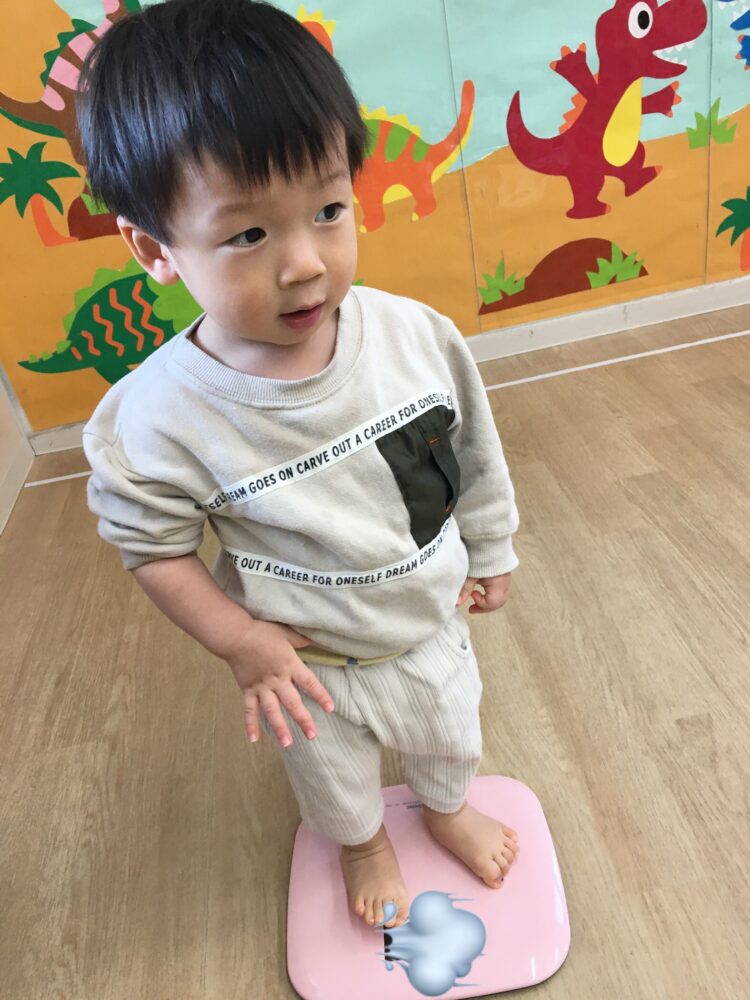 めろん組さんは、「体重計に乗ってね」と声をかけると、静かに乗ることが出来て、身長を測るときも、気をつけの姿勢がしっかり出来ていました。