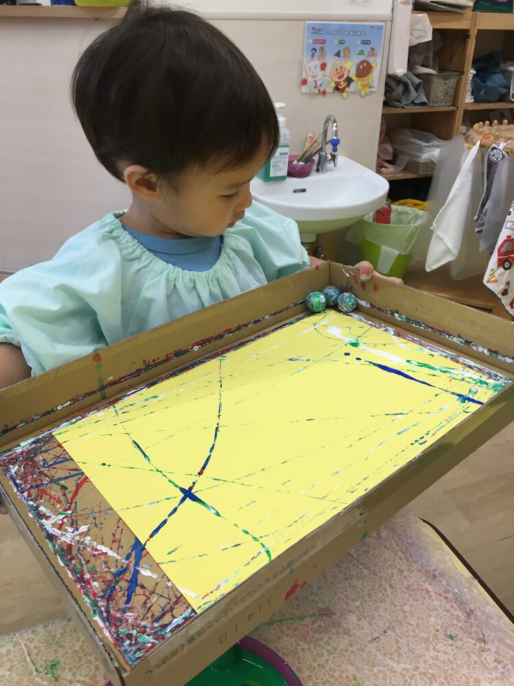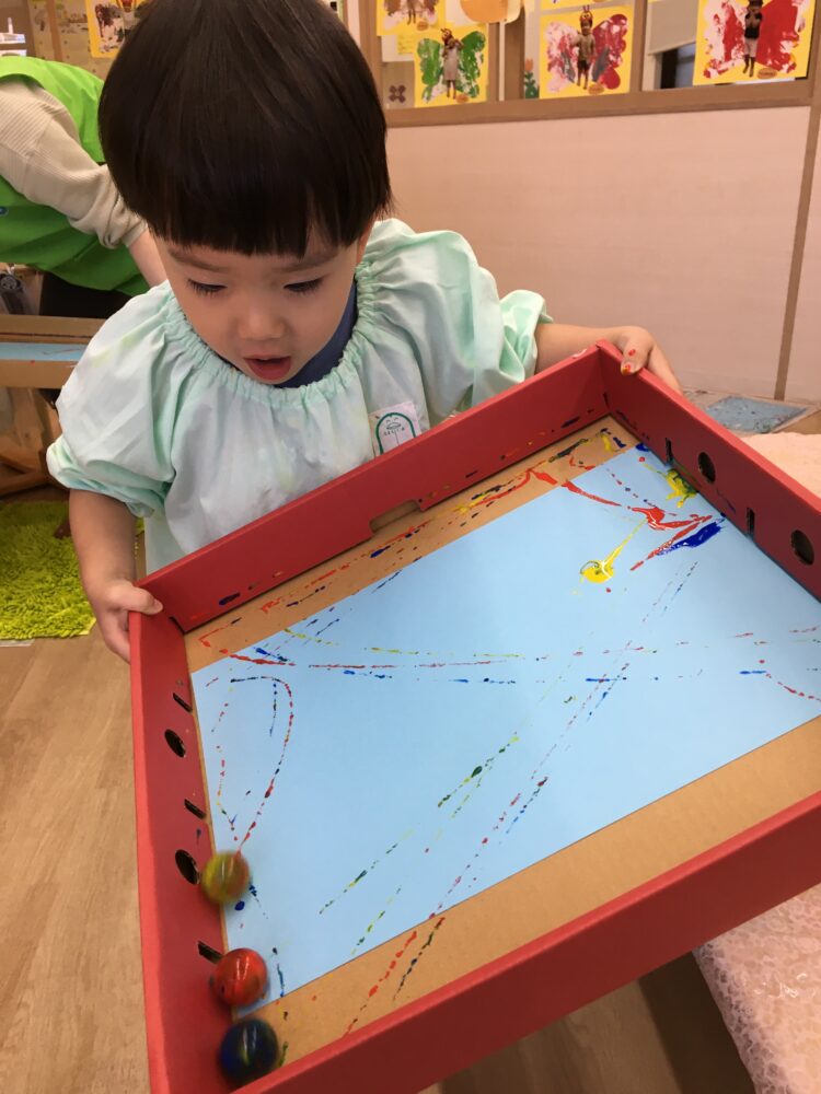 ビー玉が転がりながら色を付けていく様子を楽しみ、「どんな模様になるかな」と期待しながら箱を動かしていました。