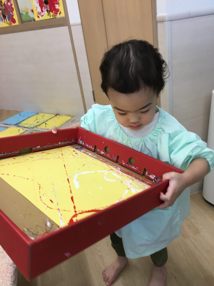どの色の絵の具を使うか迷いながら、「これにする!」と自分で決めて、指をさして選んでいました。