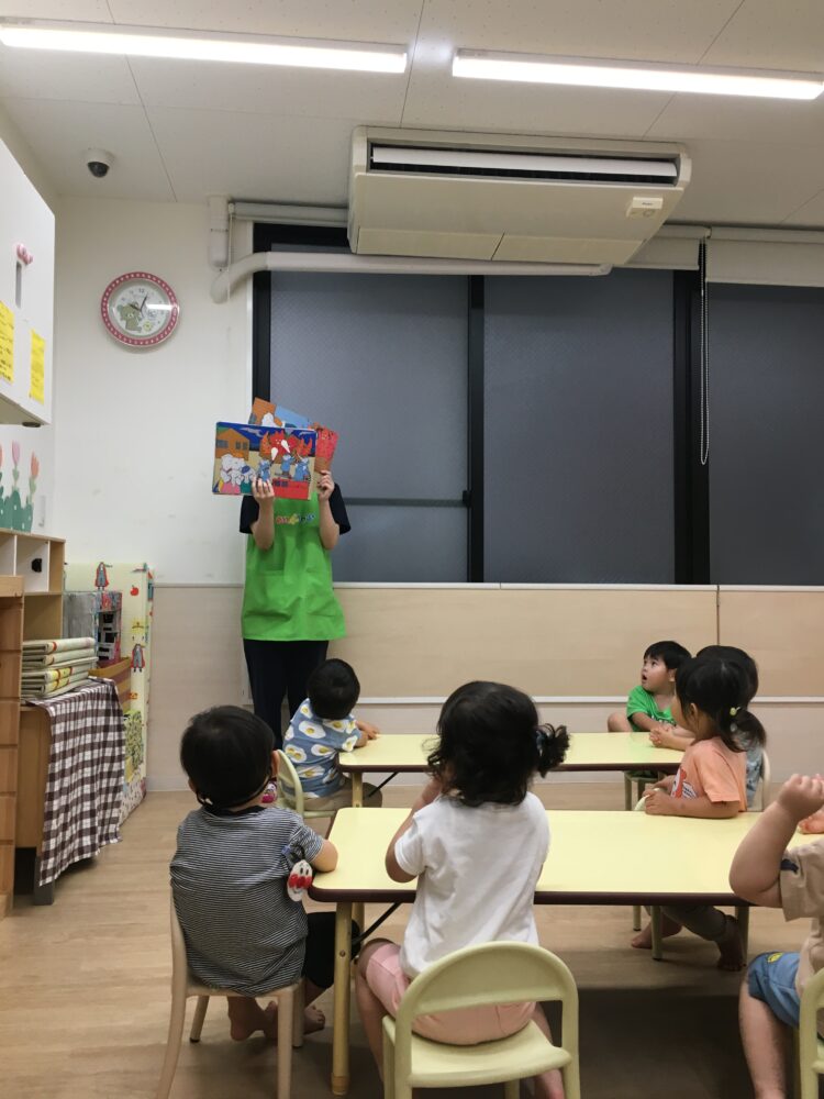 まずは紙芝居の『おれさまはカジノモト』とフラッシュカードの『おかしも』を見て火事の避難について学びました。