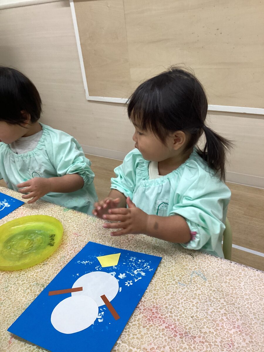 めろん組さんとばなな組さんは糊付けで、いちご組さんはシール貼りで雪だるまの製作遊びをしました⛄❄