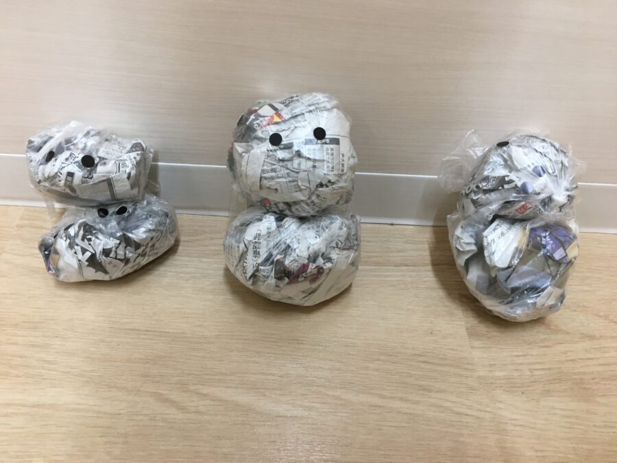 ちぎった新聞紙を袋に入れていくと、「ダンゴムシみたい!」「ゆきだるまみたい!」など子どもたちが色んなものに見立てていたので、そのまま雪だるまの案を取り入れて、シールを貼って雪だるまさんを作りました⛄️