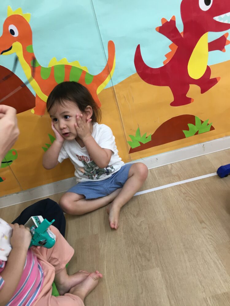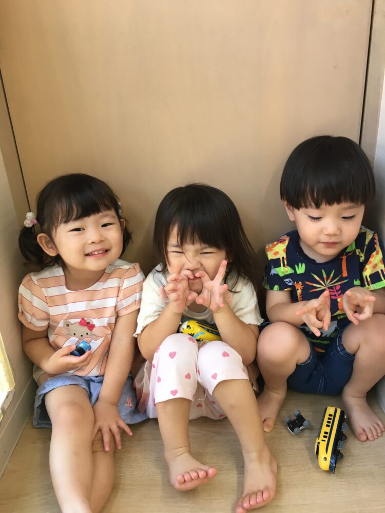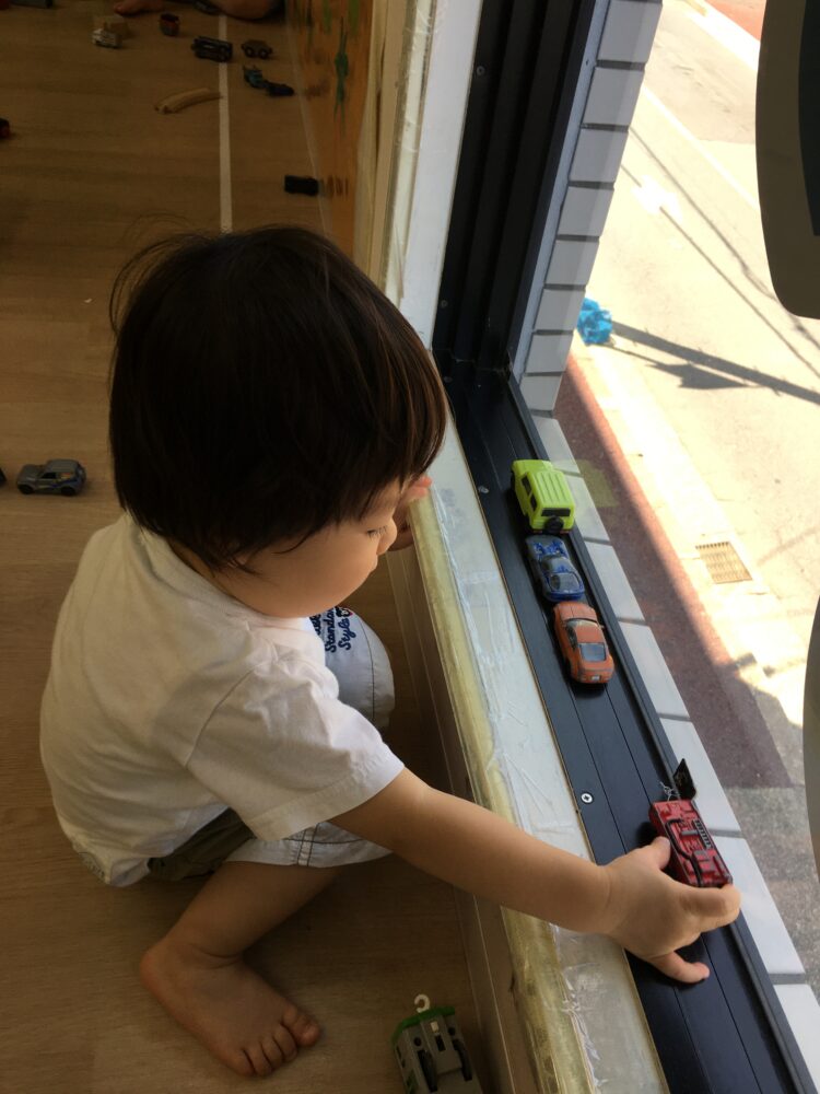 線路を繋げて電車を走らせたり、ミニカーを並べたり、お友だちと仲良く座っている場所をお風呂に見立てたりと、みんな思い思いに遊んでいました。