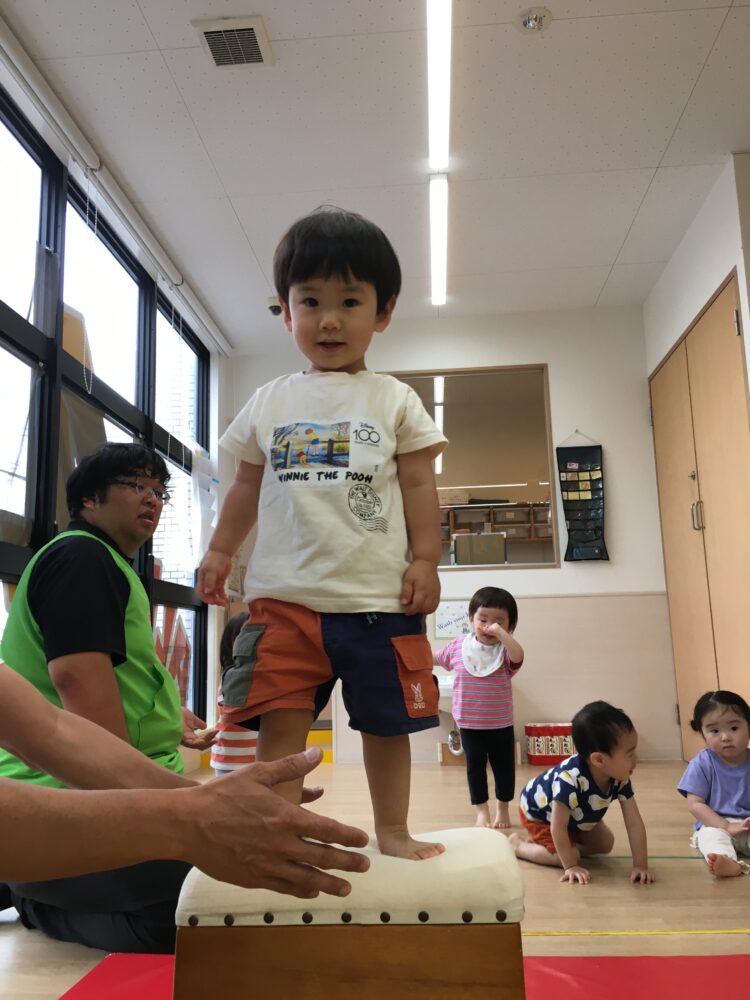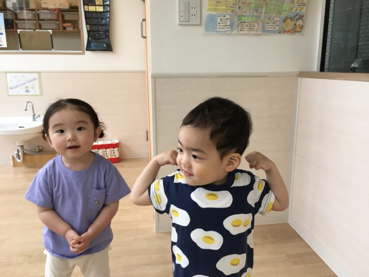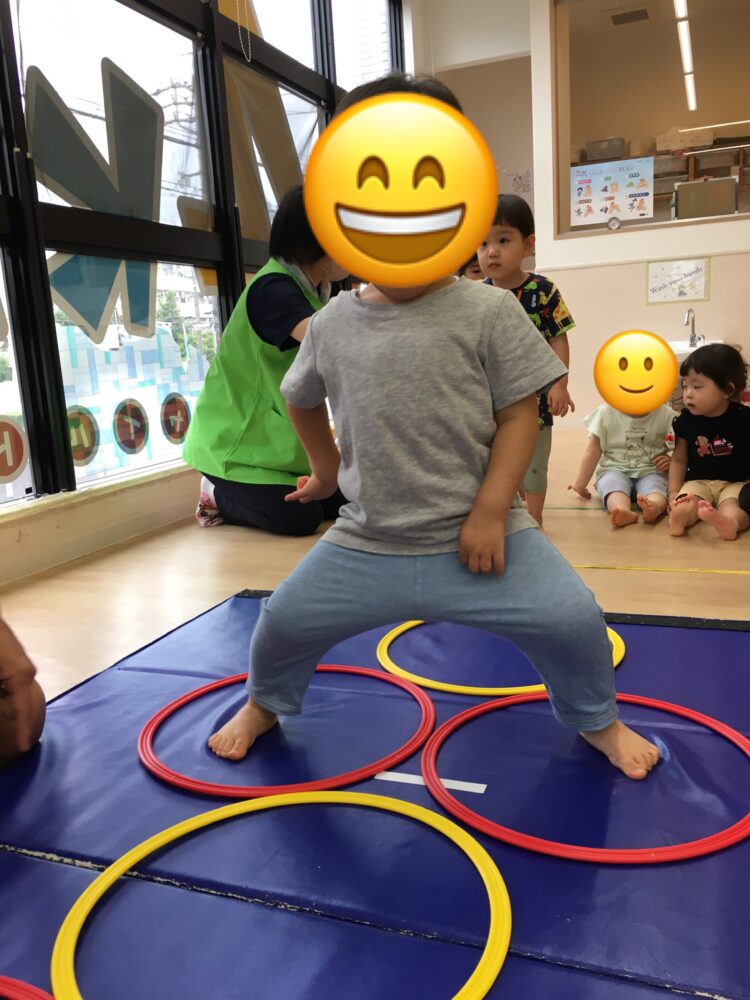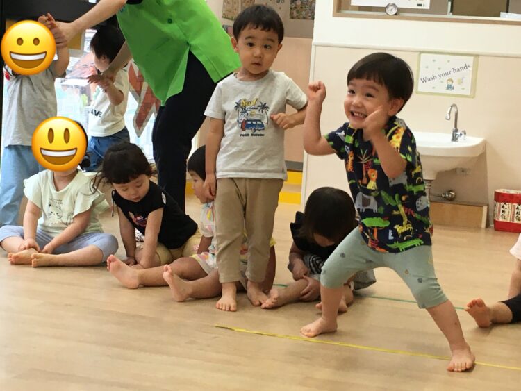 先生のところまで競走する時に、よーいドンという前に「がんばるぞ!」とポーズと言葉を言ってはりきっている様子😊