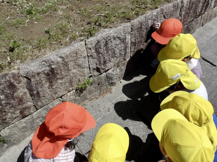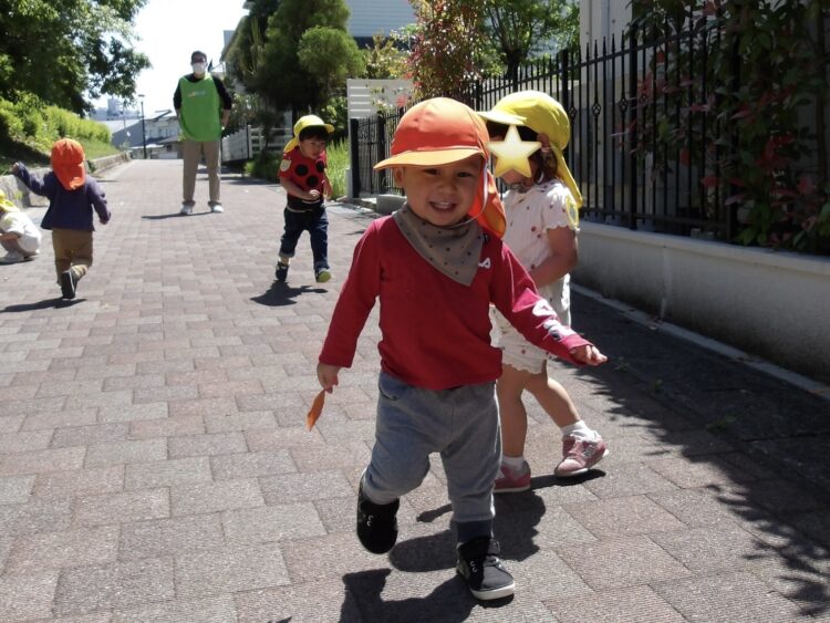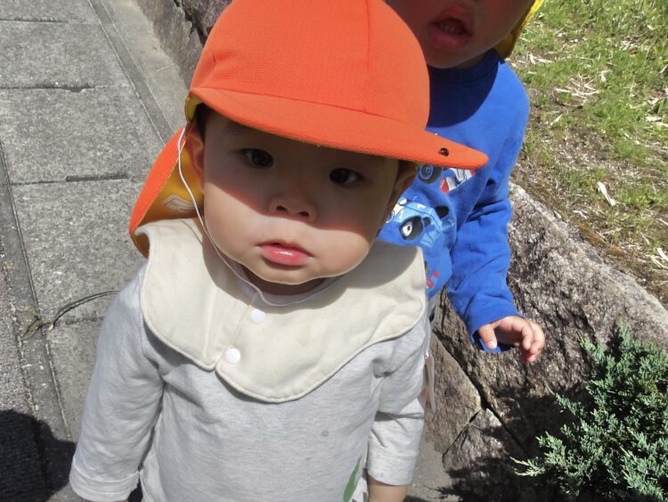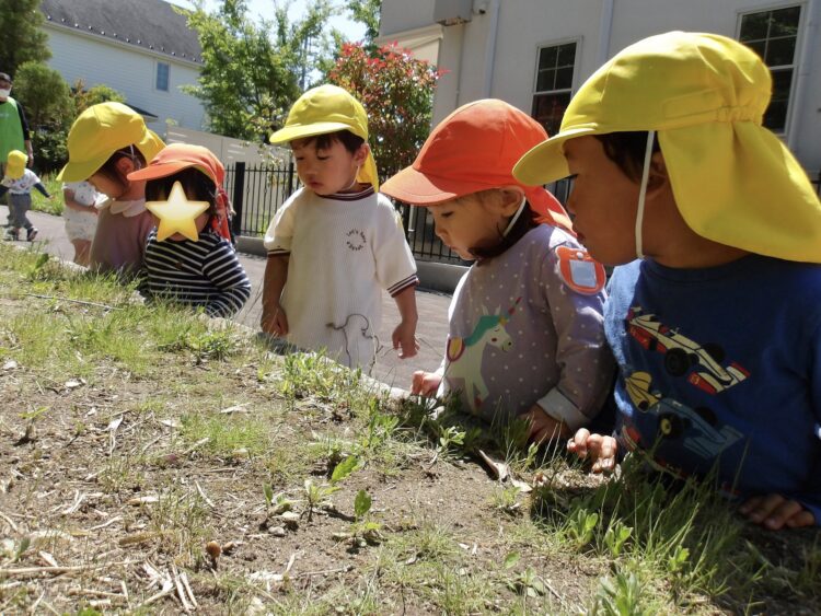 「こっちにおおきいむしがいるよー!」と教えてくれたので向かうと、大きなカメムシ。大きな虫の迫力に、一定の距離を保ちながら丸くなって観察していましたよ。「おおきいね」「これ、なんだろうね」と興味津々。しばらく見つめているとブーン!と飛び立ち、びっくりした子どもたちも「きゃー!わー!!」と逃げていきました。