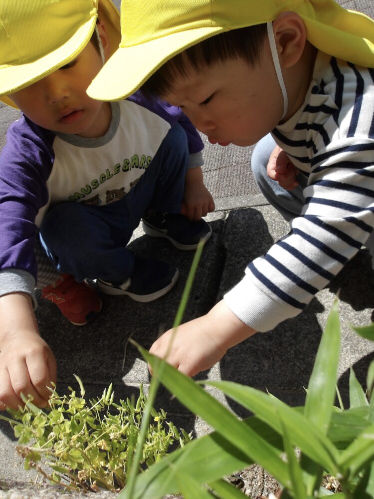 お花もたくさん生えていましたよ。カタバミという花を観察していると、プチプチ!と種が弾け飛びました。「わー!とんだ!でてきたねー!」とビックリしながらも嬉しそうに種を見つけては触ってみていましたよ。