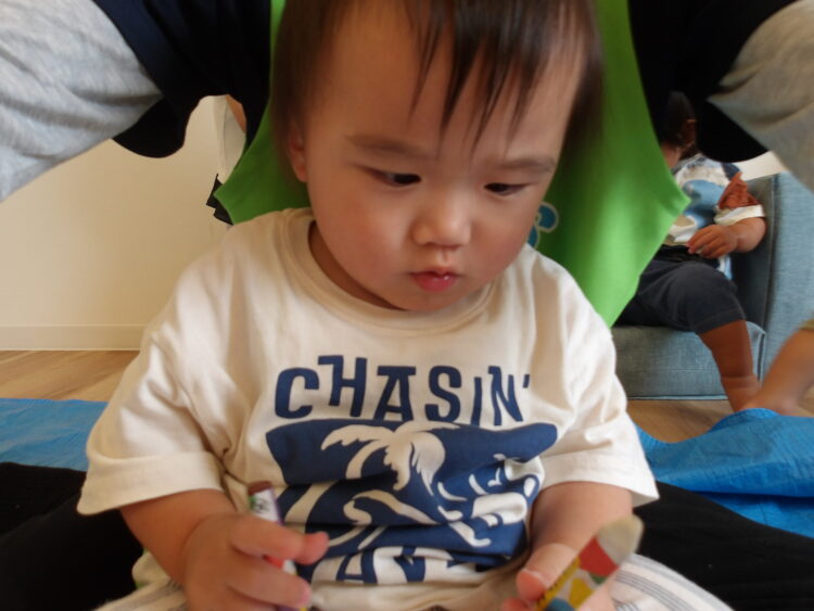 ひよこ組のお友だちもクレヨンを手に取ると、不思議そうに眺めたりうさぎ組やあひる組のお友だちの真似をして、紙に書いてみたりしたいました🤭