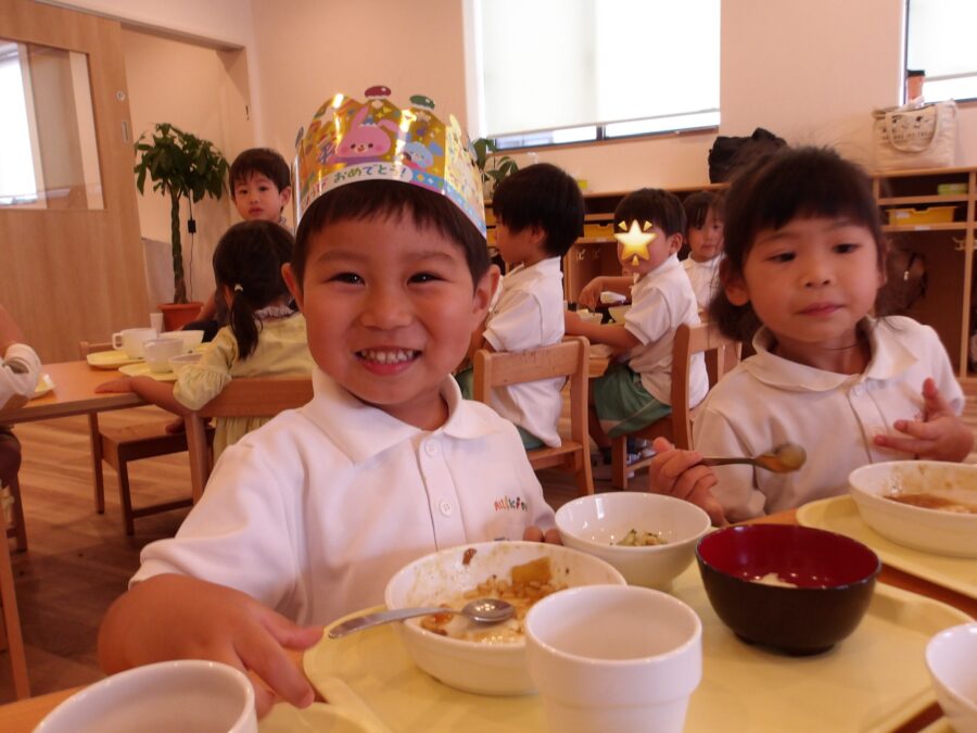 誕生日会の日の恒例、給食のカレーライスを盛りもり食べていました!