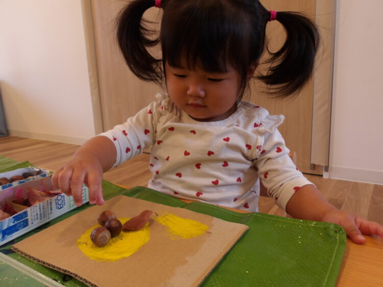 落ち葉をそのまま貼ったりビリビリと細かくちぎって貼ったりと、素敵な作品ができました✨