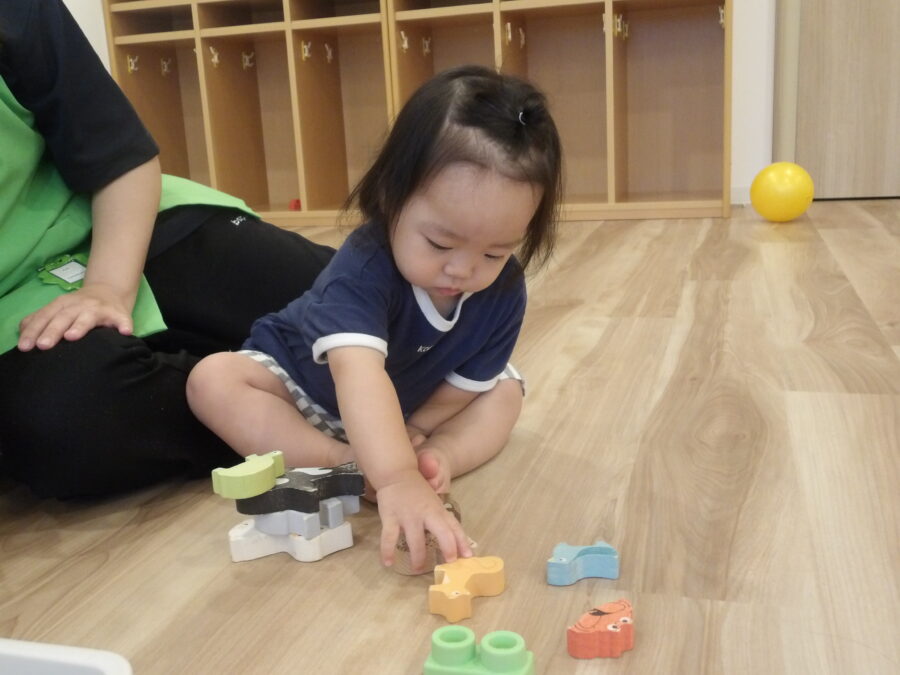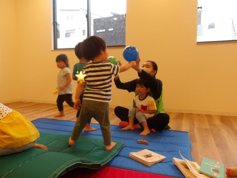 ボールのお部屋では動物の積木を積んで遊んだり、風船を投げてふわふわと落ちてくる様子を楽しむ姿も見られました🎈