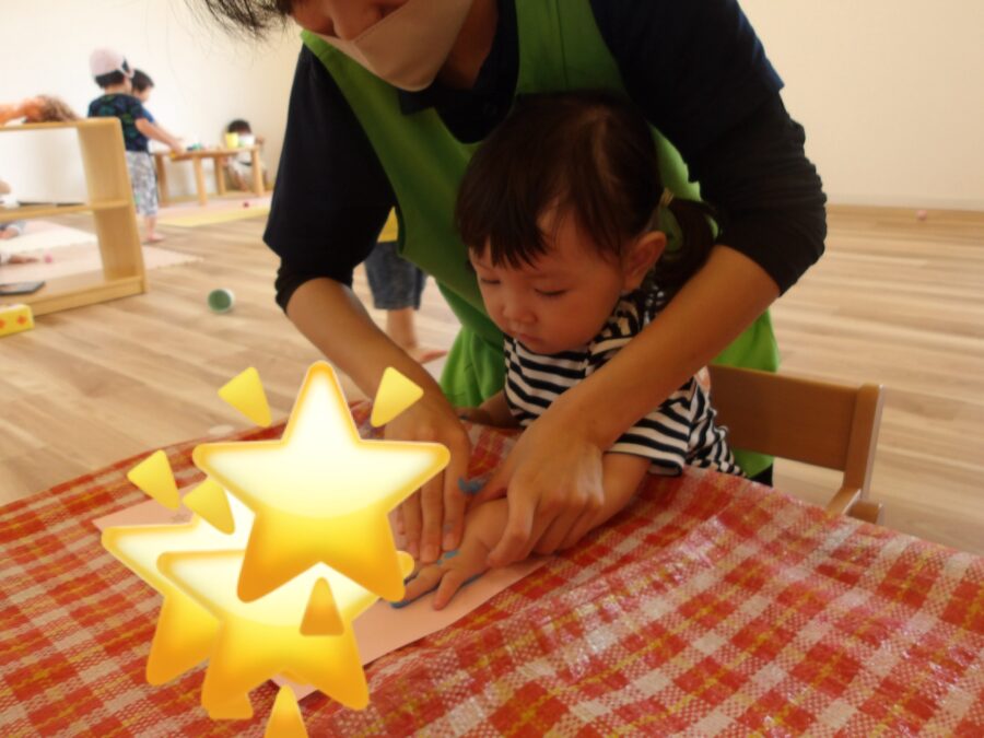 保育士と一緒に手形をぺったん!かわいいプレゼントができましたよ![]()