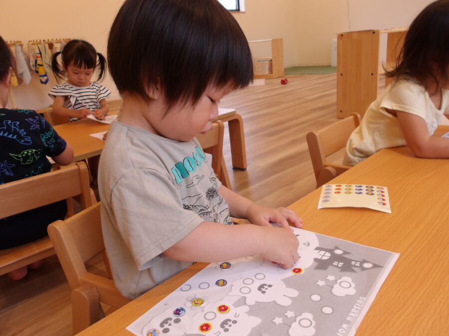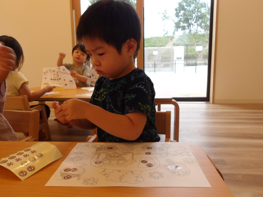 シール貼りのお部屋では、自分で選んだ台紙にペタペタと貼る姿が見られました🤭