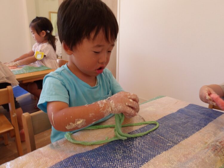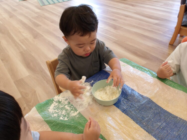 今日は小麦粘土で遊びました!前回とは違い、粉から触ってみることに。