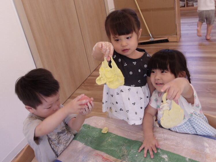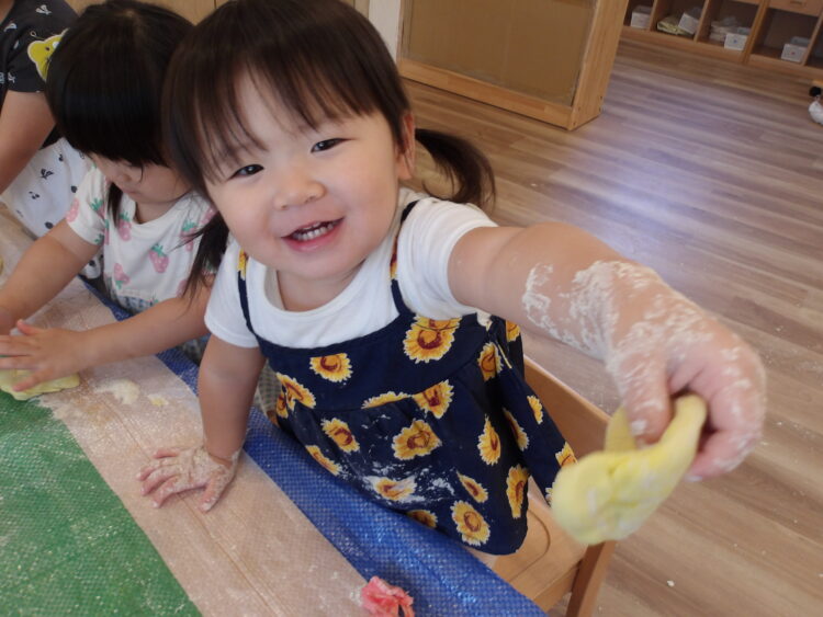 「ピザだよ」「パンみたい」とつぶやきながらこねていました。「何色にする?」とみんなに聞くと、「きいろー」「ピンクー!」と次々にリクエストが!