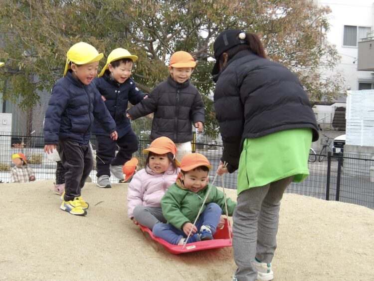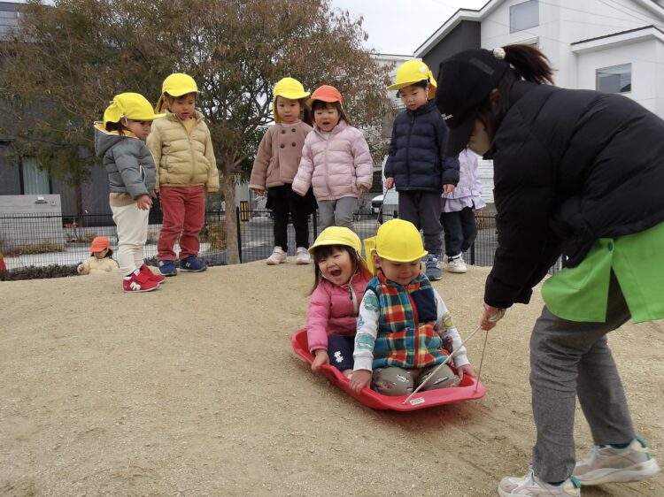 そして、今日はそりで遊びましたよ!✨シューっと滑り降りるそりに大興奮の子どもたち!✨後ろから楽しそうに追いかけて、何度も丘を登ったり降りたりしてあそんでいました。