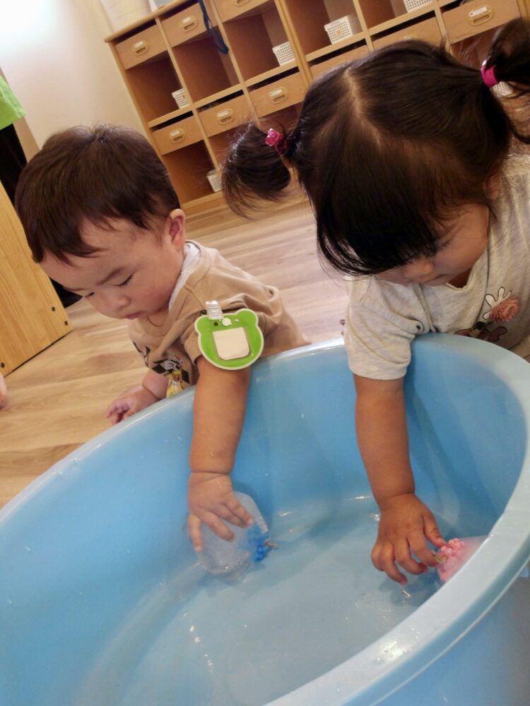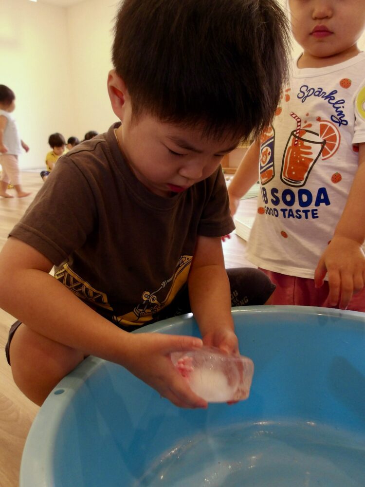 今日は氷で感触あそびをおこないました。中にあるおもちゃが取りたいお友だち。どうやったら溶けるか、試行錯誤する姿がありましたよ。