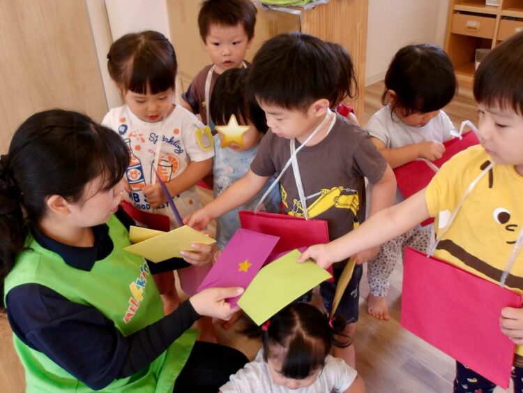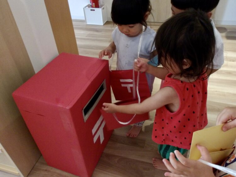 最近楽しんでいる絵本〈ゆうびんです〉から、郵便屋さんごっこを楽しんでいる子どもたち。
