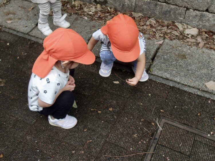 今日から保育参加ということで、保護者の方と一緒に外で遊びましたよ。遊歩道にはどんぐりがたくさん!みんな嬉しそうに拾っていましたよ。