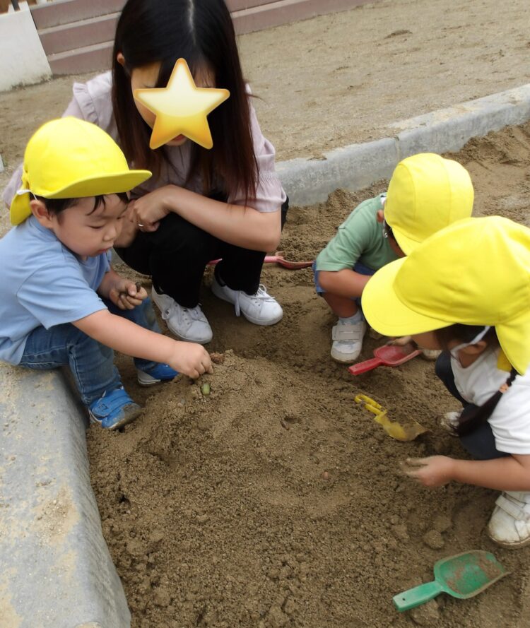 保育園では園庭で遊んでいたうさぎ組がお土産のどんぐりを使ってどんぐりのお山やどんぐりケーキを作りましたよ。