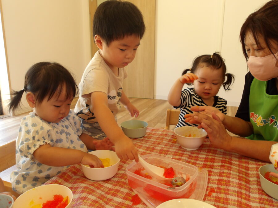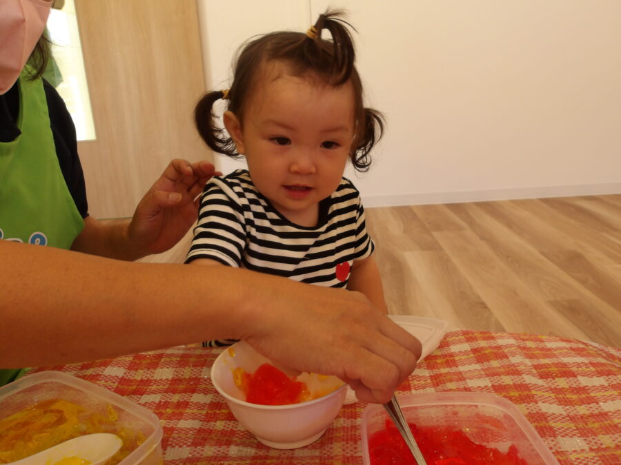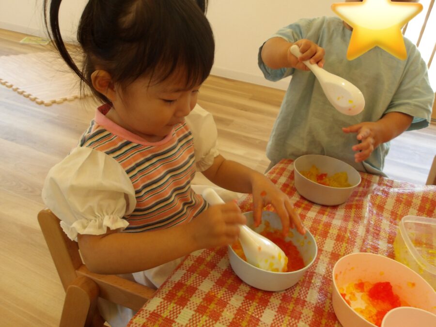 混ぜると細かくなり、キラキラと輝いている様子を見て「キラキラー!」と嬉しそうに教えてくれる子もいました