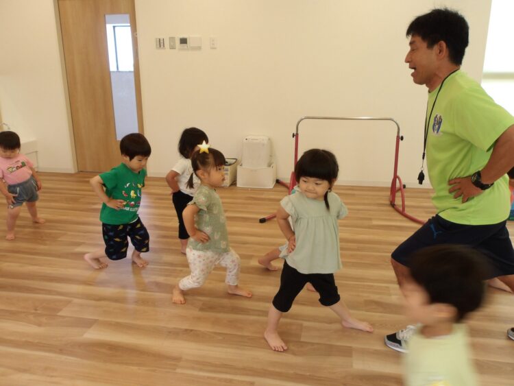 準備運動はお手のもの。「いっちに、さんし」声に合わせて先生の動きを真似します。