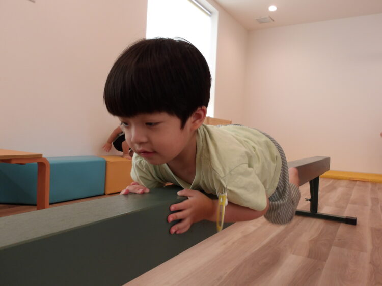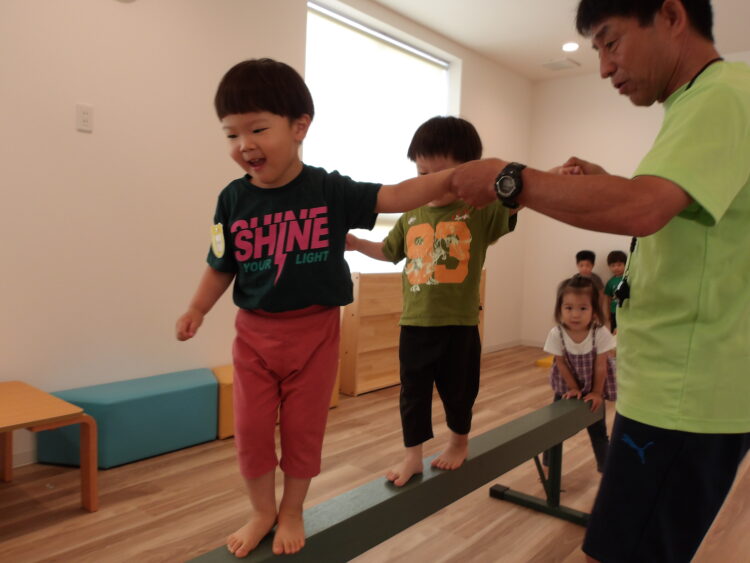 今日はこれ。これなーんだ?というクイズに「なんだっけ?」「みどり!」と答える子どもたち。平均台と教えてもらうと「へいきんだい」と繰り返していましたよ。