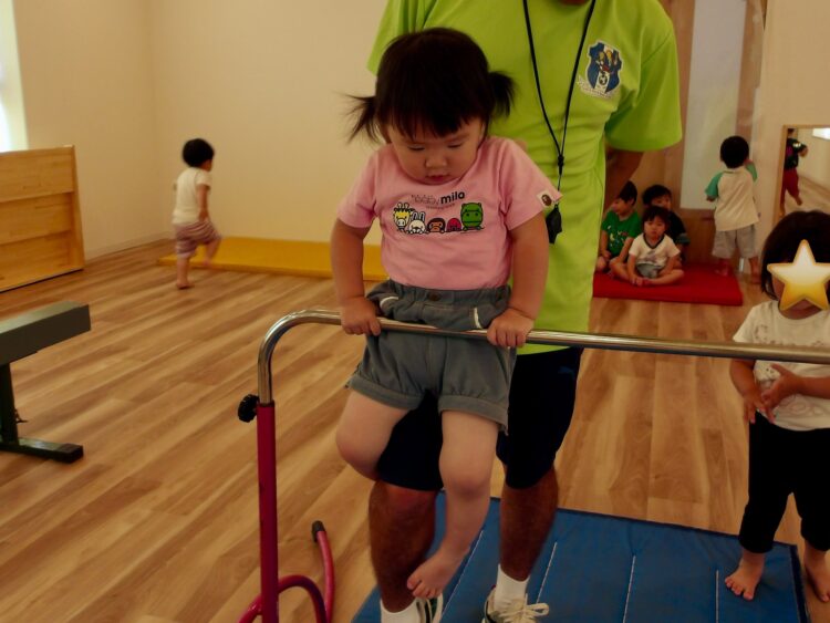 鉄棒と平均台で練習しました。まだ一人では難しいですが、先生と一緒に一生懸命取り組んでいましたよ。できるとニコニコ笑顔を見せてくれました。