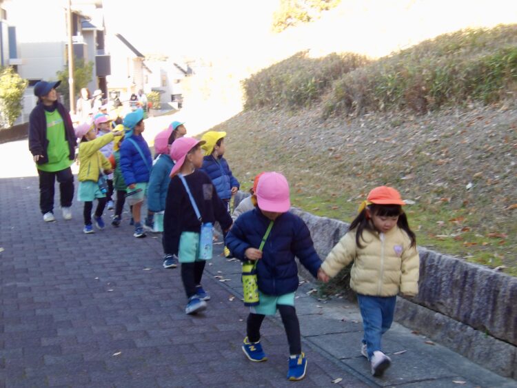 遊歩道では風に乗ってヒラヒラと葉っぱが落ちてくるのをみんなで目で追いかけたりしながら歩きました。
