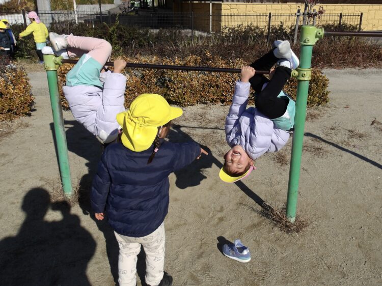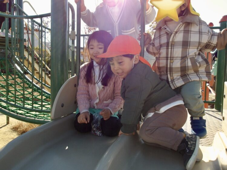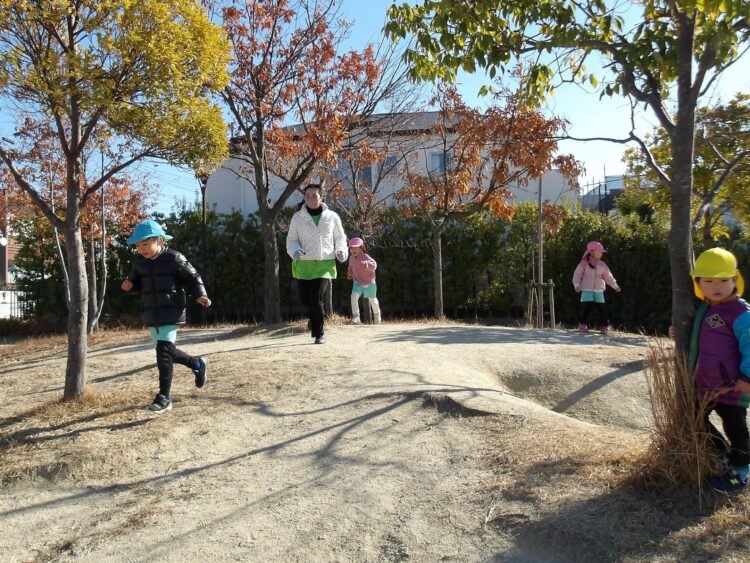 公園では、なかなかいつも一緒に遊ぶ機会のない保育者と追いかけっこをしたり、違うクラスのお友だちとあそびを共有する姿がありました。