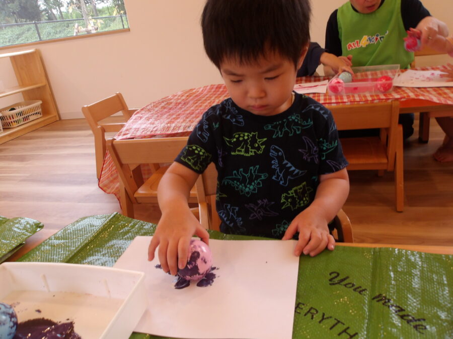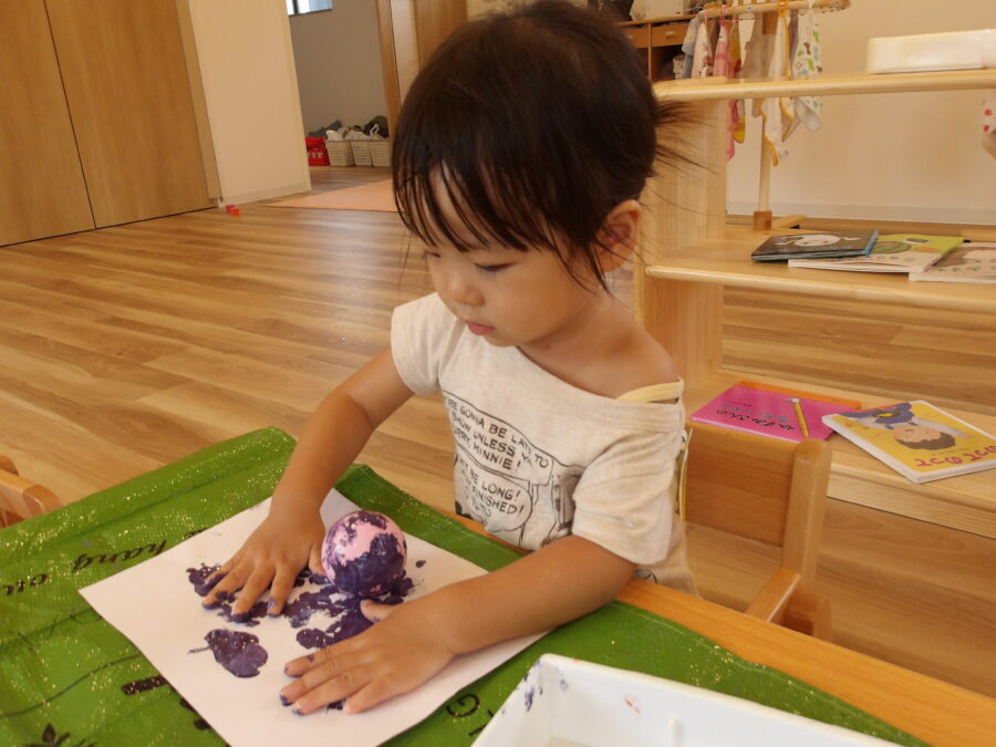 小さなボールに絵の具をつけて紙にポンっと押してみると丸い形ができて子どもたちは夢中になって押していましたよ![]()