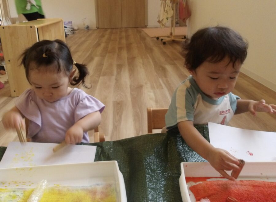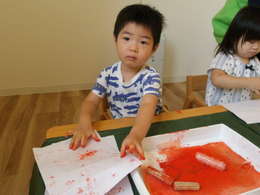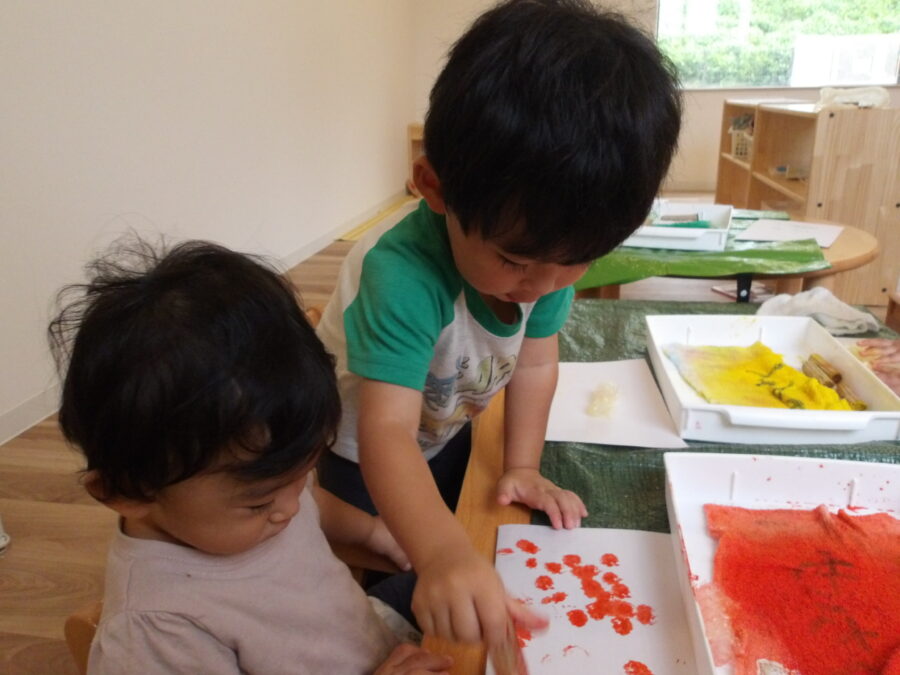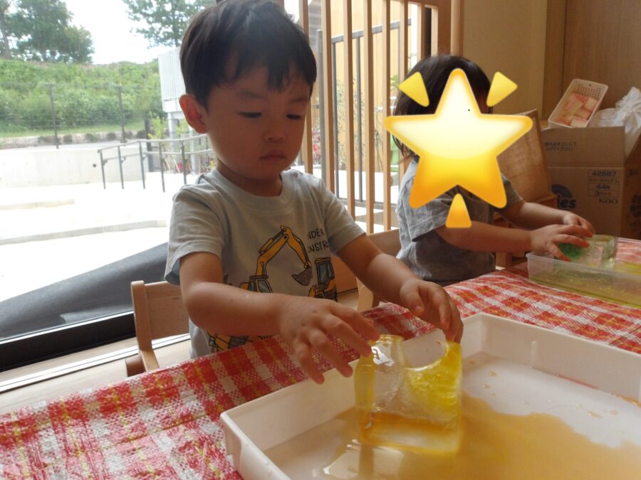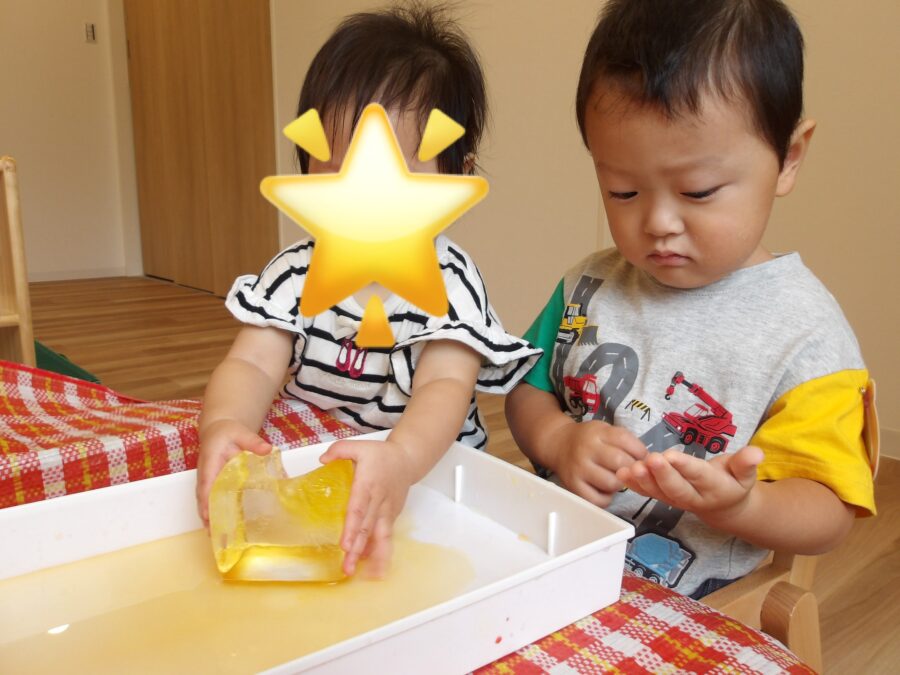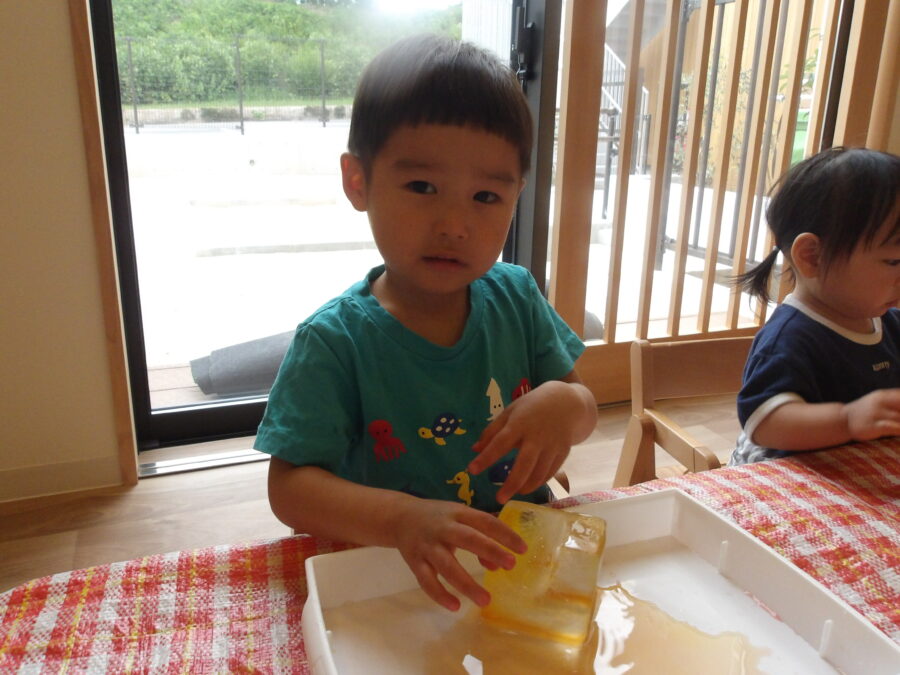 今日は室内でスタンプ遊びをしたり氷遊びをしたりしました!