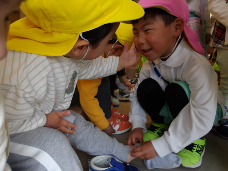 今日はワクワクで園庭へ出発のあひる組とうさぎ組。お散歩に行く年上のお友だちと玄関で出会いました。