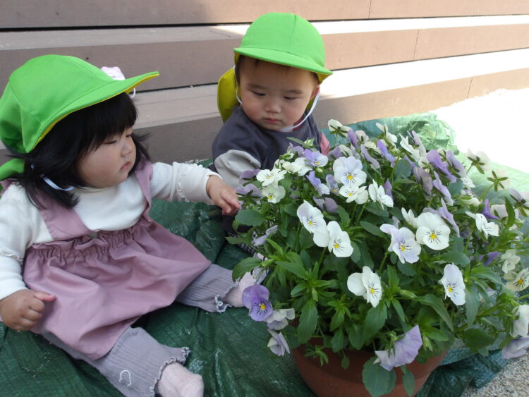 ひよこ組はカートから降りて、砂の感触を確かめたり、花を観察したりして自然の一部に触れました。