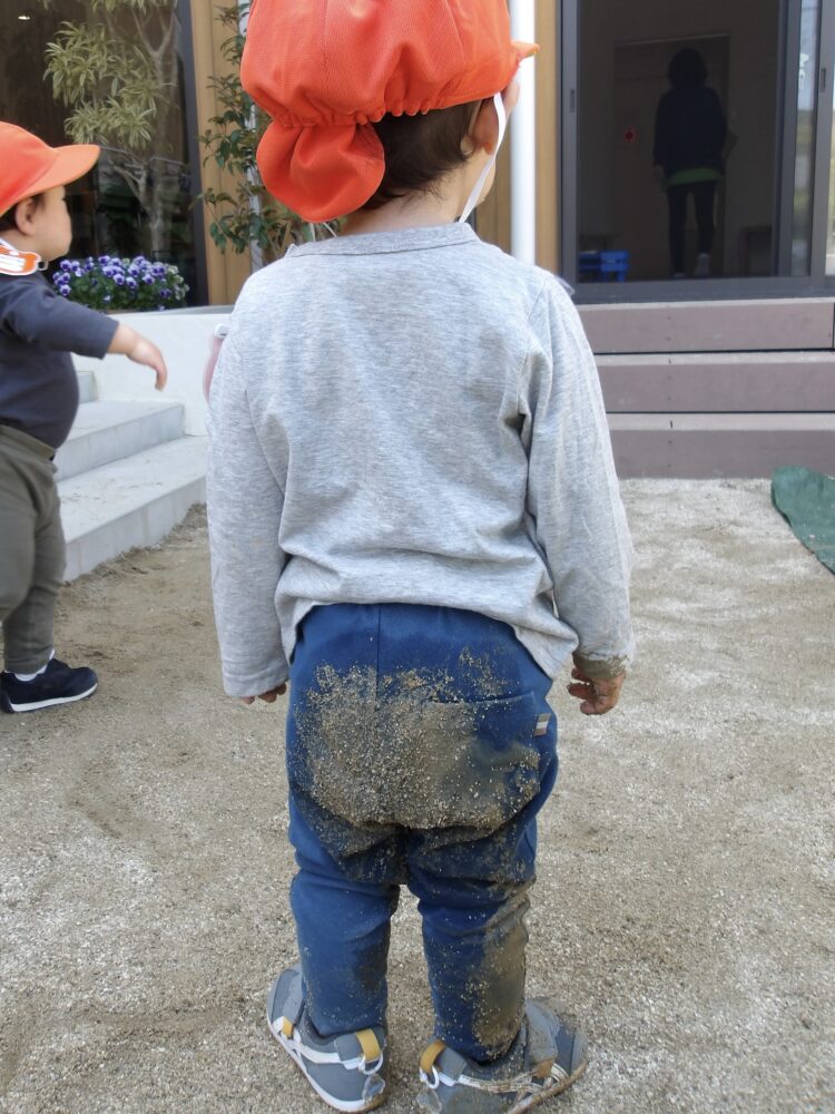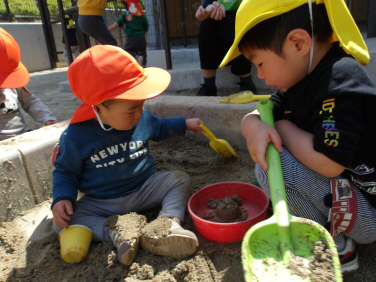みんなが大好きな砂場はまだ少し水を含んでいます。