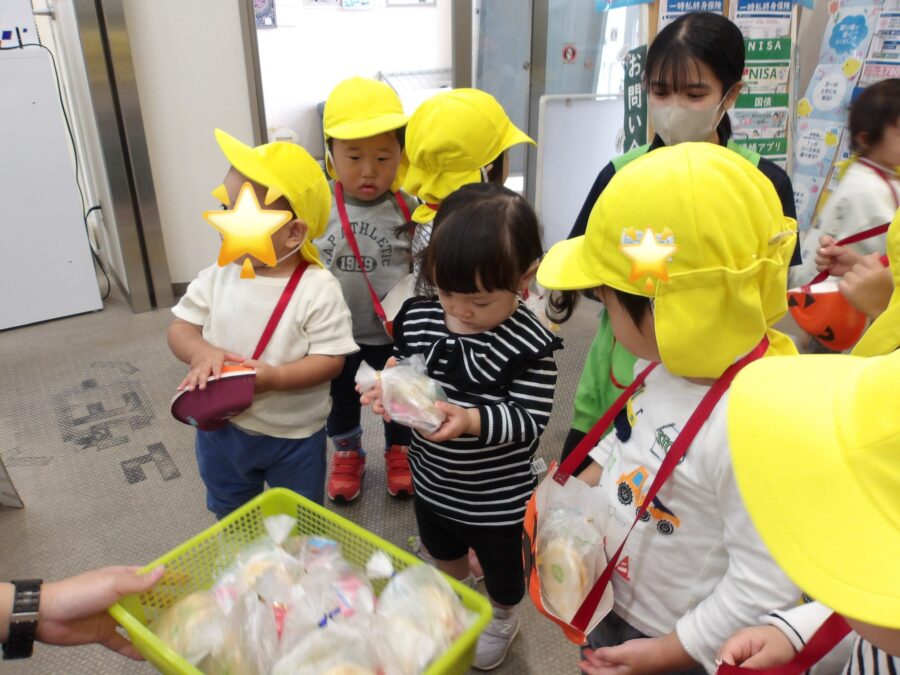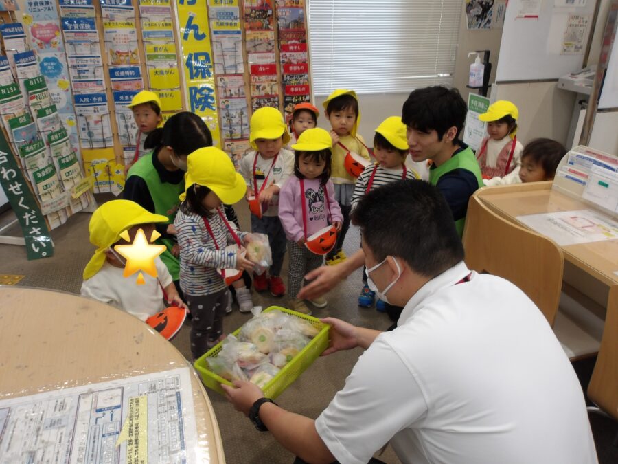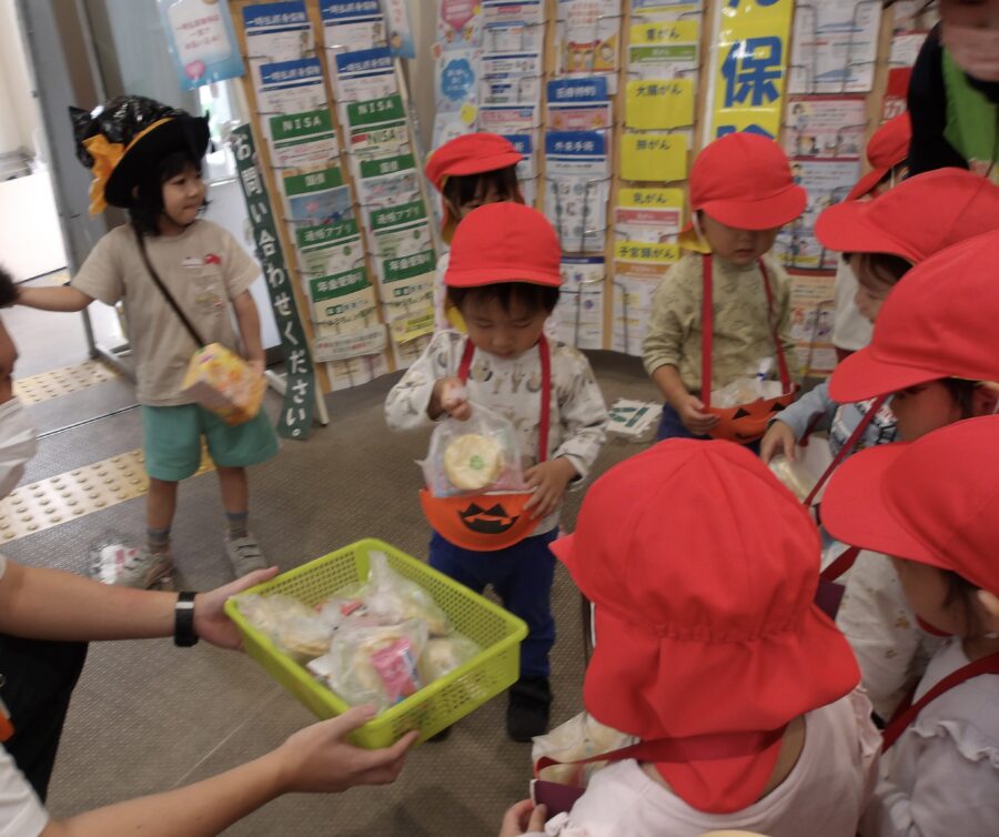 郵便局に入ると少し緊張気味でしたが、職員の方に元気いっぱい「トリックオアトリート!」ということができましたよ![]()