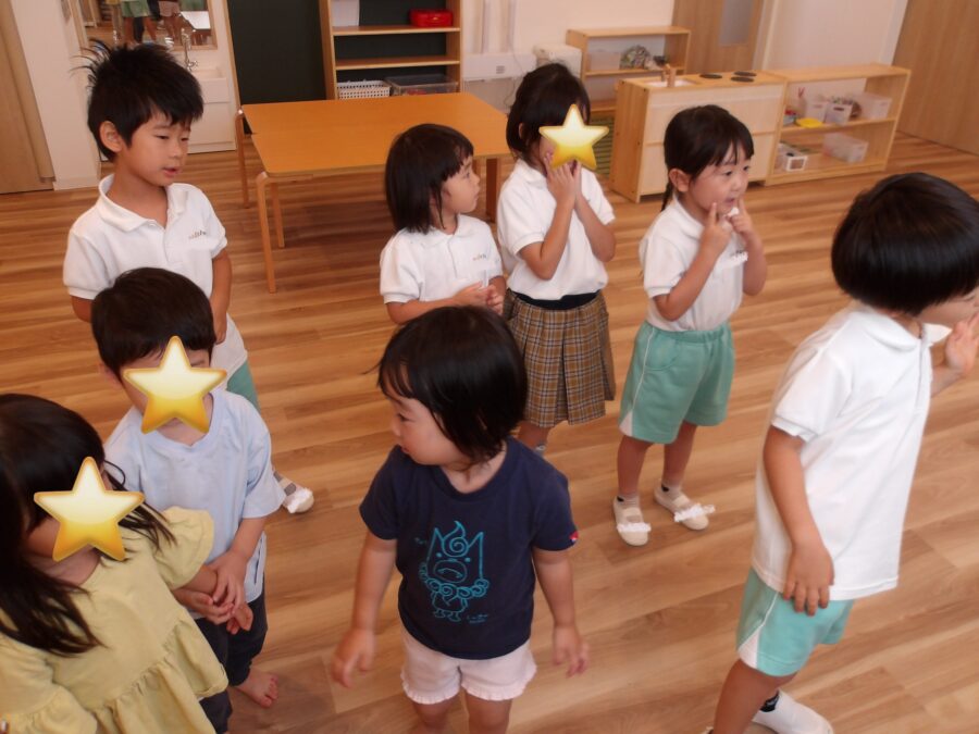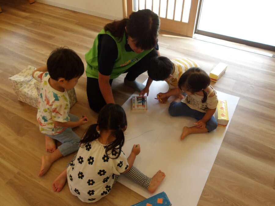 今日は、English Timeを楽しんだり、画用紙に線路を描いて働く車を走らせて遊んだり、トンネルをくぐったりして元気に遊んでいました。