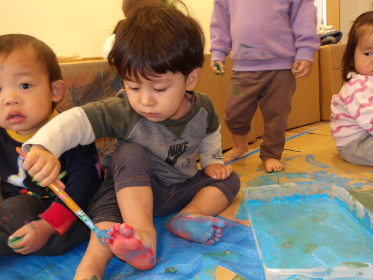 ひよこ組あひる組は絵の具遊びをしました。