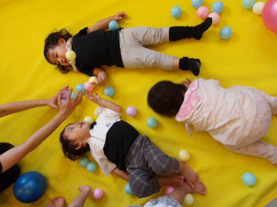 保育士が、上からボールや新聞紙のシャワーをすると、「きゃー!」と大興奮で遊んでいましたよ♪