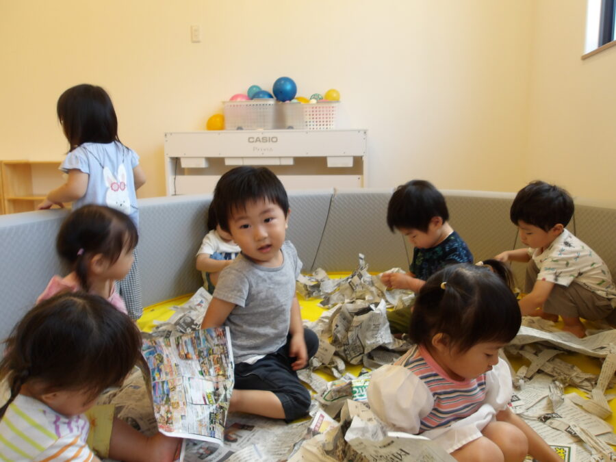 新聞紙のプールでは、新聞紙を細かくちぎったり、