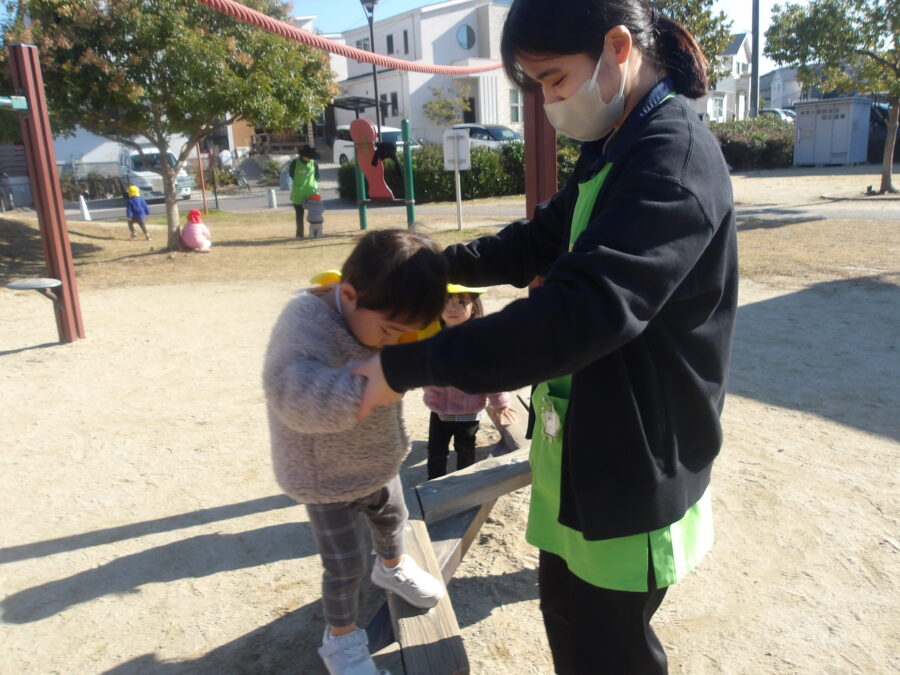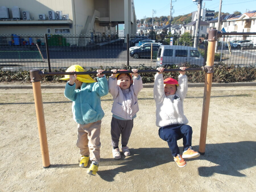 何度も何度も繰り返し滑り台を楽しんでいましたこっちはバランス〜! 先生と手を繋ぎながらアスレチック遊びを楽しんでいました!先生見て見てー! 凄いでしょ! 沢山ぶら下がれるよ〜木の実も沢山落ちてたよ! 沢山拾ってカメラにポーズ!📸